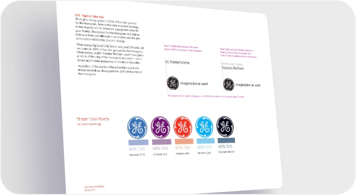 3.05 Tagline: Color Use The tagline always prints in 100% of the color you use for the Monogram. Refer to the color migration strategy matrix on page 4.02 to determine appropriate colors for your Market. The artwork for the Monogram and tagline lock-up is fixed, and although it can scale in size, the size and position relationship does not change. Level 1 (GE Brand) and Level 2 (Market) When adding a Level 3 (Solution Platform), When using only Level 1 (GE Brand) and Level 2 (Market), all print in 100% of the color of the Monogram. Level 3 prints in 100% of the color and text prints in 100% of the color you use for the Monogram. Levels 1 and 2 become a 40% tint of the color. When adding Level 3 (Solution Platform), Level 3 text prints in 100% of the color of the Monogram and Levels 1 and 2 GE Market Name GE Market Name (Brand and Market) text print in a 40% tint of that color. Solution Platform Regardless of the number of brand architecture levels shown, the lock-up always prints in 100% of the color of the Monogram. imagination at work imagination at work Monogram and/or tagline always print in 100% of the color. All components align flush left. “Bright” Color Palette (B2B Print Advertising) 40% Tint 40% Tint 40% Tint 40% Tint 40% Tint Pantone: 7455 Pantone: 260 Pantone: 485 Process Cyan Pantone: Black 6 B2B Print Advertising Version 1.0