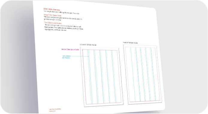 13.02 Grids: Overview Two simple elements make up the our grid. These are: Image/ Clear Space Guide The outer magenta key line indicates the area in which to position images and text. Text Columns and Gutters The vertical cyan rules indicate body text columns with fixed gutters. Most grids use six columns, as shown. When appropriate, use fewer columns. Metric A4 Full Grid, Portrait US Letter Full Grid, Portrait Image /Clear Space Guide Text Columns and Gutters B2B Print Advertising Version 1.0