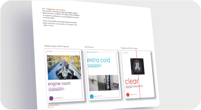 6.07 Imagery: Non-Cut-Out Rules You may also use full or partially cropped photographs. When cut-outs do not bleed off a page, use the center line as a guide for positioning. Do not use key line art around any photographs. Always maintain the correct clear space around the brand architecture components and Monogram and tagline lock-up. Maximum image size – 50% of image area. Full width image. Imagery uses center line as a guide. GE Energy GE Consumer & Industrial GE Healthcare extra cold Lorem ipsum dolor sit amet, consectetuer adipiscing elit, sed diam nonummy nibh euismod tincidunt ut laoreet dolore magna aliquam erat volutpat. Ut wisi enim ad minim veniam, quis nostrud exerci tation ullamcorper suscipit lobortis nisl ut aliquip ex ea commodo consequat. Duis autem vel eum iriure dolor in hendrerit in vulputa. engine engine roomroom clear Lorem ipsum dolor sit amet, consectetuer adipiscing elit, sed diam nonummy nibh euismod tincidunt ut laoreet dolore magna aliquam erat Lorem ipsum dolor sit amet, consectetuer adipiscing elit, sed diam nonummy nibh euismod tincidunt volutpat. Ut wisi enim ad minim veniam, quis nostrud exerci tation ut laoreet dolore magna aliquam erat volutpat. Ut wisi enim ad minim veniam, quis nostrud exerci ullamcorper suscipit lobortis nisl ut aliquip ex ea commodo consequat. tation ullamcorper suscipit lobortis nisl ut aliquip ex ea commodo consequat. Duis autem vel eum Duis autem vel eum iriure dolor in hendrerit in vulputa. iriure dolor in hendrerit in vulputa. imagination at work imagination at work imagination at work B2B Print Advertising Version 1.0