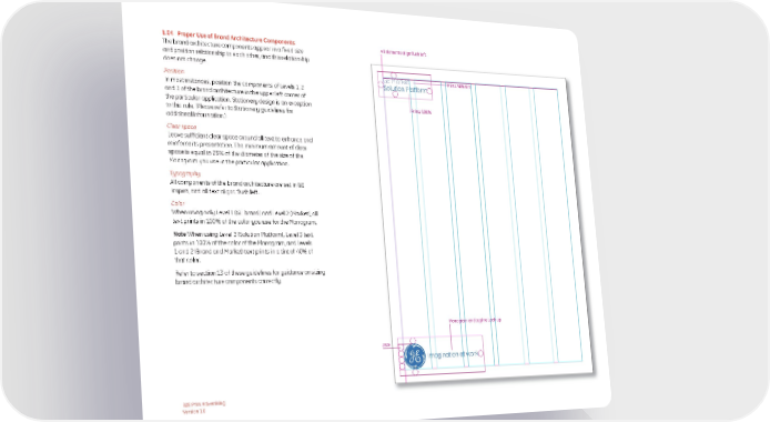 1.04 Proper Use of Brand Architecture Components All elements align flush left The brand architecture components appear in a fixed size and position relationship to each other, and this relationship does not change. Position GE Market Prints 40% tint In most instances, position the components of Levels 1, 2 Solution Platform and 3 of the brand architecture in the upper left corner of the particular application. Stationery design is an exception Prints 100% to this rule. (Please refer to Stationery guidelines for additional information.) Clear space Leave sufficient clear space around all text to enhance and reinforce its presentation. The minimum amount of clear space is equal to 25% of the diameter of the size of the Monogram you use in the particular application. Typography All components of the brand architecture are set in GE Inspira, and all text aligns flush left. Color When using only Level 1 (GE brand) and Level 2 (Market), all text prints in 100% of the color you use for the Monogram. Note When using Level 3 (Solution Platform), Level 3 text prints in 100% of the color of the Monogram, and Levels 1 and 2 (Brand and Market) text prints in a tint of 40% of that color. Refer to section 13 of these guidelines for guidance on sizing brand architecture components correctly. Monogram and tagline Lock-up 25% imagination at work B2B Print Advertising Version 1.0