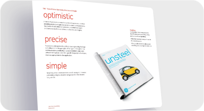 7.02 Tone of Voice: Optimistic, Precise and Simple optimistic A sense of optimism is central to our brand expression, and that sensibility leads to imaginative and innovative communications. Our media should reflect an optimistic, unpretentious spirit, Headlines and demonstrate that we deliver on what we can imagine. Use headlines that communicate the benefit clearly and specifically, noting product or service capabilities. Make them inventive, using wit to evoke the desired response. precise When possible, let the headline reveal something new or unexpected about GE. Precision is a dimension that reflects our engineering heritage and adherence to the principles of Six Sigma. Throughout our communications, avoid jargon, unsubstantiated claims and verbose descriptions. Use clear, specific language and imagery that are appropriate for the application. simple Simplicity in our communications results in impact. It means presenting complex services and products in the clearest way we can. B2B Print Advertising Version 1.0