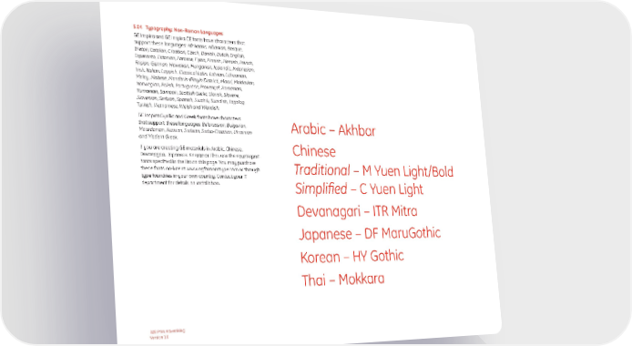5.04 Typography: Non-Roman Languages GE Inspira and GE Inspira CE fonts have characters that support these languages: Afrikaans, Albanian, Basque, Breton, Catalan, Croation, Czech, Danish, Dutch, English, Esperanto, Estonian, Faroese, Fijian, Finnish, Flemish, French, Frisian, German, Hawaiian, Hungarian, Icelandic, Indonesian, Irish, Italian, Lappish, Classical Latin, Latvian, Lithuanian, Malay, Maltese, Mandarin (Pinyin District), Maori, Moldavian, Norwegian, Polish, Portuguese, Provençal, Romanian, Rumanian, Samoan, Scottish Gælic, Slovak, Slovene, Slovenian, Serbian, Spanish, Swahili, Swedish, Tagalog, Turkish, Vietnamese, Welsh and Wendish. GE Inspira Cyrillic and Greek fonts have characters that support these languages: Belorussian, Bulgarian, Arabic – Akhbar Macedonian, Russian, Serbian, Serbo-Croatian, Ukrainian and Modern Greek. If you are creating GE materials in Arabic, Chinese, Chinese Devanagari, Japanese, Korean or Thai, use the counterpart fonts specified in the list on this page. You may purchase these fonts on-line at www.agfamonotype.com or through Traditional – M Yuen Light/Bold type foundries in your own country. Contact your IT department for details on installation. Simplified – C Yuen Light Devanagari – ITR Mitra Japanese – DF MaruGothic Korean – HY Gothic Thai – Mokkara B2B Print Advertising Version 1.0