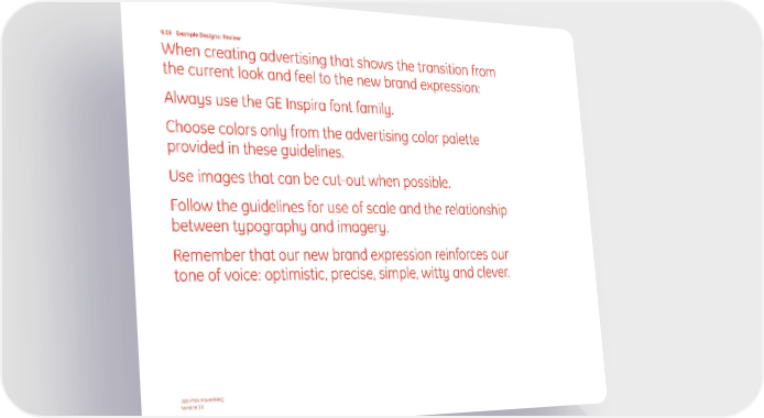 9.06 Example Designs: Review When creating advertising that shows the transition from the current look and feel to the new brand expression: Always use the GE Inspira font family. Choose colors only from the advertising color palette provided in these guidelines. Use images that can be cut-out when possible. Follow the guidelines for use of scale and the relationship between typography and imagery. Remember that our new brand expression reinforces our tone of voice: optimistic, precise, simple, witty and clever. B2B Print Advertising Version 1.0
