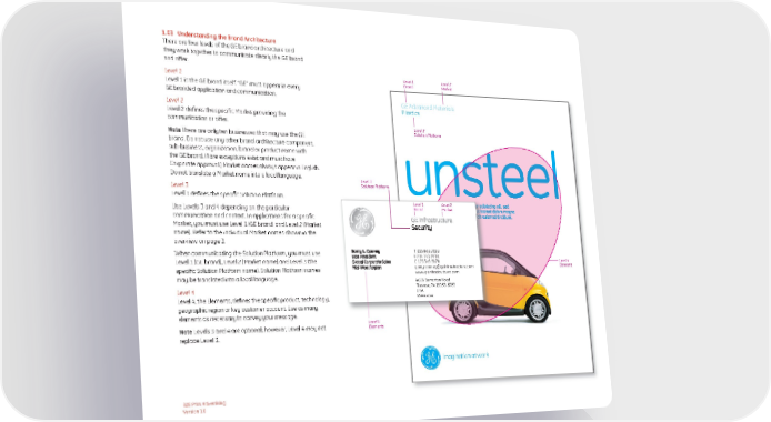 1.03 Understanding the Brand Architecture There are four levels of the GE brand architecture and they work together to communicate clearly the GE brand and offer. Level 1 Level 1 Level 2 Brand Market Level 1 is the GE brand itself. “GE” must appear in every GE branded application and communication. GE Advanced Materials Level 2 Plastics Level 2 defines the specific Market providing the communication or offer. Level 3 Note There are only ten businesses that may use the GE Solution Platform brand. Do not use any other brand architecture component, sub-business, organization, brand or product name with the GE brand. (Rare exceptions exist and must have Corporate approval.) Market names always appear in English. Do not translate a Market name into a local language. Level 3 Level 3 Solution Platform u Level 3 defines the specific Solution Platform. Level 1 Level 2 Use Levels 3 and 4 depending on the particular Brand Market communication and context. In applications for a specific Market, you must use Level 1 (GE brand) and Level 2 (Market name). Refer to the individual Market names shown in the overview on page 3. When communicating the Solution Platform, you must use T 215 942 3018 F 215 353 2938 Level 1 (GE brand), Level 2 (Market name) and Level 3 (the C 123 345 5678 Level 4 specific Solution Platform name). Solution Platform names garry.cooney@geinfrastructure.com Elements www.geinfrastructure.com may be translated into a local language. 4636 Somerton Road Level 4 Trevose, PA 19053-6783 USA Level 4, the Elements, defines the specific product, technology, GE Infrastructure geographic region or key customer account. Use as many elements as necessary to convey your message. Level 4 Note Levels 3 and 4 are optional; however, Level 4 may not Elements replace Level 3. imagination at work B2B Print Advertising Version 1.0