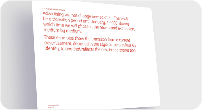 9.01 Example Designs: Overview Advertising will not change immediately. There will be a transition period until January, 1 2005, during which time we will phase in the new brand expression, medium by medium. These examples show the transition from a current advertisement, designed in the style of the previous GE identity, to one that reflects the new brand expression. B2B Print Advertising Version 1.0