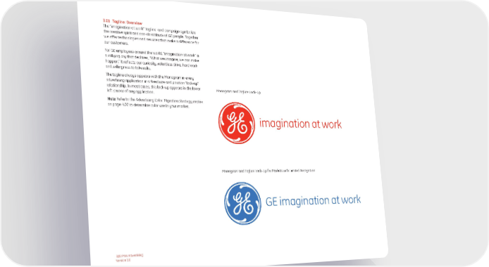 3.01 Tagline: Overview The “imagination at work” tagline and campaign symbolize the creative spirit and can-do attitude of GE people. Together we offer technologies and services that make a difference for our customers. For GE employees around the world, “imagination at work” is a rallying cry that declares, “What we imagine, we can make happen.” It reflects our curiosity, relentless drive, hard work and willingness to take risks. The tagline always appears with the Monogram in every advertising application in a fixed size and position “lock-up” relationship. In most cases, this lock-up appears in the lower Monogram and Tagline Lock-Up left corner of any application. Note Refer to the Advertising Color Migration Strategy matrix on page 4.02 to determine color use in your market. imagination at work Monogram and Tagline Lock-Up for Markets with Limited Recognition GE imagination at work *Please refer to the matrix on page 4.02 to determine if you are required to include “GE” in your tagline. B2B Print Advertising Version 1.0