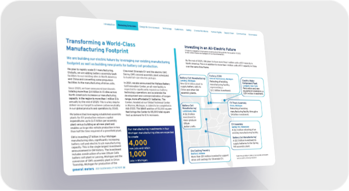 Transforming a World-Class Manufacturing Footprint We are building our electric future by leveraging our existing manufacturing footprint as well as building new plants for battery cell production. We plan to rapidly scale EV manufacturing. Globally, we are adding battery assembly/pack facilities to our existing sites in North America and China and converting some propulsion facilities to the manufacturing of drive units. Since 2020, we have announced investments totaling more than $14 billion in 10 sites across North America to increase our manufacturing capacity in the region to more than 1 million EVs annually by the end of 2025. This is a key step to deliver on our target to achieve carbon neutrality in our global products and operations by 2040. We believe that leveraging established assembly plants for EV production reduces capital expenditures up to $1.5 billion per assembly plant versus building an all-new plant and enables us to go into vehicle production in less than half the time required of a greenfield plant. GM is investing $7 billion in four Michigan manufacturing sites, significantly increasing battery cell and electric truck manufacturing capacity. This is the single largest investment announcement in GM history. The investment includes construction of a new Ultium Cells battery cell plant in Lansing, Michigan and the conversion of GM’s assembly plant in Orion Township, Michigan for production of the Chevrolet Silverado EV and the electric GMC Sierra, GM’s second assembly plant scheduled to build full-size electric pickups. In 2021, we also announced the Wallace Battery Cell Innovation Center, an all-new facility is expected to significantly expand our battery technology operations and accelerate the development and commercialization of longer- range, more affordable EV batteries. The Center, located at our Global Technical Center in Warren, Michigan, is slated to be completed in mid-2022. The latest addition of 50,000 square feet brings the Center to 85,000 total square feet as demand for EVs increases. Investing in an All-Electric Future (Projects completed, in progress or announced through the first quarter of 2022 in the United States as examples of our transformation) By the end of 2025, GM plans to have more than 1 million units of EV capacity in North America. This is in addition to more than 1 million units of EV capacity in China over the same time frame. Battery Cell Manufacturing 1 Lansing, Michigan New $2.6 billion plant to supply battery cells to Orion and other GM assembly plants. Factor y ZERO Detroit Hamtramck, Michigan Retooling of existing manufacturing facility, representing a $2.3 billion investment. Electric Motor Component Plant Lockport, New York Renovation and new equipment installation, a $154 million investment. Battery Cell Manufacturing 1 Lordstown, Ohio A $2.3 billion investment to mass-produce Ultium battery cells. EV Truck Assembly Orion, Michigan Retooling of existing manufacturing facility through a $4 billion investment. EV Assembly Spring Hill, Tennessee A $2.3 billion retooling of an existing manufacturing facility. Battery Cell Manufacturing 1 A $2.3 billion investment to supply batteries to the Spring Hill assembly plant. Die Casting Foundry Bedford, Indiana More than $51 million invested to support drive unit castings for Silverado EV. 1 B uilt through Ultium Cells LLC (an equally owned joint venture with LG Energy Solution) Our manufacturing investments in four Michigan manufacturing sites are expected to create 4,000 new jobs and retain 1,000 jobs in Michigan. Skip Navigation Introduction Reducing Emissions Design for Environment Technology Customers Safety Diverse Workforce Human Rights Supply Chain Communities Governance 2021 SUSTAINABILITY REPORT 22
