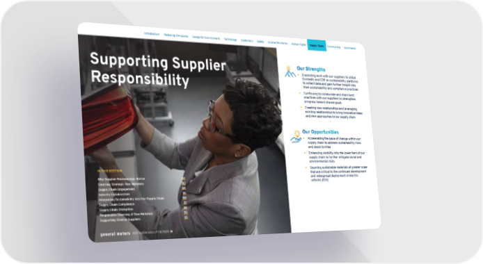 Supporting Supplier Responsibility IN THIS SECTION Why Supplier Relationships Matter 82 Sourcing Strategic Raw Materials 83 Supply Chain Engagement 84 Industry Collaboration 85 Integrating Sustainability Into Our Supply Chain 86 Supply Chain Compliance 91 Supply Chain Disruption 92 Responsible Sourcing of Raw Materials 93 Supporting Diverse Suppliers 95 Our Strengths y Expanding work with our suppliers to utilize EcoVadis and CDP as sustainability platforms to collect data and gain further insight into their sustainability and compliance practices y Continuing to collaborate and share best practices with our suppliers to strengthen progress toward shared goals y Creating new relationships and leveraging existing relationships to bring innovative ideas and new approaches to our supply chain Our Opportunities y Accelerating the pace of change within our supply chain to address sustainability risks and opportunities y Enhancing visibility into the lower tiers of our supply chain to further mitigate social and environmental risks y Sourcing sustainable materials at greater scale that are critical to the continued development and widespread deployment of electric vehicles (EVs) Skip Navigation Introduction Reducing Emissions Design for Environment Technology Customers Safety Diverse Workforce Human Rights Supply Chain Communities Governance 2021 SUSTAINABILITY REPORT 81