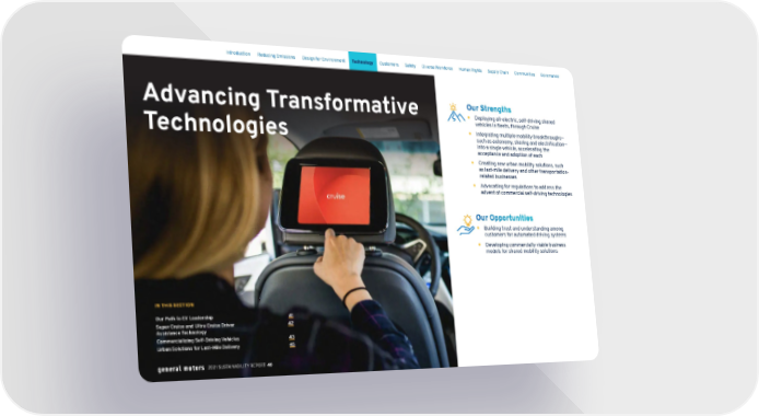 Advancing Transformative Technologies IN THIS SECTION Our Path to EV Leadership 41 Super Cruise and Ultra Cruise Driver 42 Assistance Technology Commercializing Self-Driving Vehicles 43 Urban Solutions for Last-Mile Delivery 45 Our Strengths y Deploying all-electric, self-driving shared vehicles in fleets, through Cruise y Integrating multiple mobility breakthroughs— such as autonomy, sharing and electrification— into a single vehicle, accelerating the acceptance and adoption of each y Creating new urban mobility solutions, such as last-mile delivery and other transportation- related businesses y Advocating for regulations to address the advent of commercial self-driving technologies Our Opportunities y Building trust and understanding among customers for automated driving systems y Developing commercially viable business models for shared mobility solutions Skip Navigation Introduction Reducing Emissions Design for Environment Technology Customers Safety Diverse Workforce Human Rights Supply Chain Communities Governance 2021 SUSTAINABILITY REPORT 40