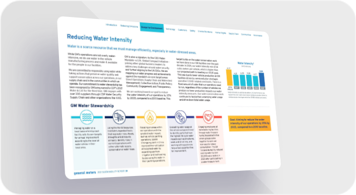 Reducing Water Intensity Water is a scarce resource that we must manage efficiently, especially in water-stressed areas. While GM’s operations are not overly water- intensive, we do use water in the vehicle manufacturing process and make it available for the people in our facilities. We are committed to responsibly using water while taking actions that preserve water quality and support conservation across our operations, in our supply chain and in the communities in which we operate. Our commitment to water stewardship has been recognized by GM being named to CDP’s 2021 Water A List for the third time. GM engages with over 300 suppliers through CDP Water Security Supply Chain and other organizations like AIAG. GM is also a signatory to the CEO Water Mandate—a U.N. Global Compact Initiative— joining other global business leaders to address key challenges around water security and further aligning to the UN SDGs. We are mapping our water progress and achievements against the mandate’s six core target areas: Direct Operations; Supply Chain and Watershed Management; Collective Action; Public Policy; Community Engagement; and Transparency. We are working toward our goal to reduce the water intensity of our operations by 35% by 2035, compared to a 2010 baseline. This target builds on the water conservation work we have done in our GM facilities over the past decade. In 2021, our water intensity was 4.54 cubic meters per vehicle, which is higher than our projected path to meeting our 2035 goal. This was due to lower vehicle production at GM facilities driven by semiconductor shortages and other COVID-related constraints. There is a fixed amount of water that our operations need to run, regardless of the number of vehicles we produce so lower production impacts our water intensity measures. Our water conservation work continues to tackle that underlying water usage and drive down total water usage. GM Water Stewardship Managing water on a local basis whereby each facility sets its own targets for annual improvement according to the level of water stress in their local area. Using the World Resources Institute’s Aqueduct tools that map water risks—floods, droughts and stress—to annually identify risks in current operations with either alternate supply, conservation or water reuse. Focusing on areas within our operations with the greatest water impact, such as vehicle painting operations. SGMW Chongqing plant in China improved their utilization of reclaimed water by expanding use from irrigation and roof cooling to also using the water in their painting operations. Evaluating water usage at the vehicle component level to identify parts that have the highest life cycle water impacts such as structures, seats and drivelines, and working with suppliers to help unlock opportunities for improvement. Engaging employees at manufacturing facilities through water treasure hunts, focused activities where groups come together to seek out new ways to reduce consumption. The GM Tonawanda facility reduced cooling water by over 55,000 cubic meters in 2021 after participating in a water treasure hunt. Water Intensity 1 (m3/vehicle) 2018 2020 2021 2019 1 W ater intensity is a global calculation. 2021 performance was higher than prior years due to lower vehicle production driven by semiconductor shortages and other COVID-related constraints. Goal: Aiming to reduce the water intensity of our operations by 35% by 2035, compared to a 2010 baseline. Skip Navigation Introduction Reducing Emissions Design for Environment Technology Customers Safety Diverse Workforce Human Rights Supply Chain Communities Governance 2021 SUSTAINABILITY REPORT 39