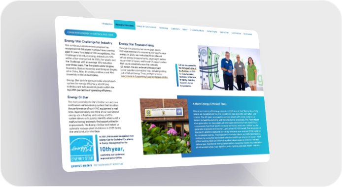 CONSERVING ENERGY IN OUR FACILITIES CONT. Energy Star Challenge for Industry This continuous improvement program has recognized 69 GM plants multiple times over the past 10 years for a total of 130 recognitions. The Challenge is to reduce energy intensity by 10% within a five-year period. In 2021, five plants met the Challenge with an average 15% reduction over three years. The five plants were Qingdao Assembly, Baojun Assembly and Dongyue Engine, all in China, Silao Assembly in Mexico and Flint Assembly in the United States. Energy Star certifications provide a benchmark system for energy efficiency, identifying buildings and auto assembly plants within the top 25th percentile of operating efficiency. Energy OnStar This tool (unrelated to GM’s OnStar service), is a continuous commissioning system that monitors the performance of our HVAC equipment in real time. Approximately one-third of our operational energy use is heating and cooling, and the system allows us to quickly identify when a unit is malfunctioning and easily find opportunities for improvement. The Energy OnStar tool helped us optimally manage plant shutdowns in 2021 during the semiconductor shortage. Energy Star Treasure Hunts Through this process, we can engage nearly 100 team members to uncover quick ways to save energy. In 2021, we conducted 17 on-site and virtual energy treasure hunts, covering 61 million square feet of space, and found 175 opportunities that could potentially save the company $5 million. We also extended this approach to our suppliers during the year, including rolling out a Virtual Energy Treasure Hunt process. Learn more in Supporting Supplier Responsibility . A More Energy-Efficient Plant One of our energy efficiency projects in 2021 was at Fort Wayne Assembly, where we manufacture the Chevrolet Silverado and GMC Sierra full-size trucks. The 35-year-old plant generated steam with large natural gas boilers to heat the building and manufacturing processes. The Powerhouse also generates six megawatts of renewable electricity from landfill gas, a renewable fuel that would normally be flared, which we instead use to generate renewable electricity as part of our RE-100 target. The remainder of the plant’s electric loads are served by wind and solar and are 100% powered by renewable energy. The project will eliminate steam, an inefficient heating method, by using the waste heat from the landfill gas engines to supply most of the building heat and converting other steam loads to direct or indirect natural gas. Additional energy conservation measures include the installation of ultraviolet lamps in air handling units, lighting and dock heater controls. GM was recognized by the Michigan Battle of the Buildings in 2021 for manufacturing resiliency in the face of rapidly changing dynamics during the pandemic. In 2021, GM received recognition from Energy Star for Sustained Excellence in Energy Management for the 10th year, confirming our continuous improvement activities. Skip Navigation Introduction Reducing Emissions Design for Environment Technology Customers Safety Diverse Workforce Human Rights Supply Chain Communities Governance 2021 SUSTAINABILITY REPORT 26