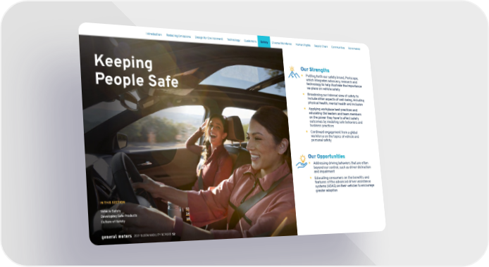 Keeping People Safe IN THIS SECTION Vehicle Safety 53 Developing Safe Products 54 Culture of Safety 59 Our Strengths y Putting forth our safety brand, Periscope, which integrates advocacy, research and technology to help illustrate the importance we place on vehicle safety y Broadening our internal view of safety to include other aspects of well-being, including physical health, mental health and inclusion y Applying workplace best practices and educating GM leaders and team members on the power they have to affect safety outcomes by modeling safe behaviors and business practices y Continued engagement from a global workforce on the topics of vehicle and personal safety Our Opportunities y Addressing driving behaviors that are often beyond our control, such as driver distraction and impairment y Educating consumers on the benefits and features of the advanced driver assistance systems (ADAS) on their vehicles to encourage greater adoption Skip Navigation Introduction Reducing Emissions Design for Environment Technology Customers Safety Diverse Workforce Human Rights Supply Chain Communities Governance 2021 SUSTAINABILITY REPORT 52