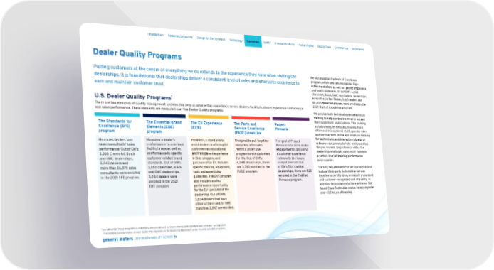 Dealer Quality Programs Putting customers at the center of everything we do extends to the experience they have when visiting GM dealerships. It is foundational that dealerships deliver a consistent level of sales and aftersales excellence to earn and maintain customer trust. We also maintain the Mark of Excellence program, which annually recognizes high- achieving dealers, as well as specific employees and teams at dealers. Out of GM’s 4,048 Chevrolet, Buick, GMC and Cadillac dealerships across the United States, 3,165 dealers and 68,403 dealer employees were enrolled in the 2021 Mark of Excellence program. We provide both technical and nontechnical training to help our dealers meet or exceed their customers’ expectations. This training includes modules for sales, finance, front office and management staff; apps for sales and service; both online and hands-on training for technicians; and interactive job aids or reference documents to help reinforce what they’ve learned. Departments within the dealership relating to sales must maintain a certain level of training performance each quar ter. Training requirements for service technicians include third-party Automotive Service Excellence certification, an industry-standard and customer-recognized seal of quality. In addition, technicians who have achieved GM World Class Technician status have completed over 435 hours of training. U.S. Dealer Quality Programs 1 There are two elements of quality management systems that help us achieve this consistency across dealers: facility/customer experience conformance and sales performance. These elements are measured over five Dealer Quality programs: The Standards for Excellence (SFE) program Measures dealers’ and sales consultants’ sales performance. Out of GM’s 3,855 Chevrolet, Buick and GMC dealerships, 3,343 dealers and more than 26,378 sales consultants were enrolled in the 2021 SFE program. The Essential Brand Elements (EBE) program Measures a dealer’s conformance to a defined facility image as well as conformance to specific customer-related brand standards. Out of GM’s 3,855 Chevrolet, Buick and GMC dealerships, 3,044 dealers were enrolled in the 2021 EBE program. The EV Experience (EVX) Provides CX standards to assist dealers in offering EV customers an educational and transparent experience in their shopping and purchase of an EV. Includes specific training, equipment, tools and advertising guidelines. The EVX program also includes a sales performance opportunity for the EV specialist at the dealership. Out of GM’s 3,834 dealers that have either a Chevy and/or GMC franchise, 2,867 are enrolled. The Parts and Service Excellence (PASE) incentive Designed to pull together many key aftersales metrics under one program to win customers for life. Out of GM’s 4,048 dealerships, there are 3,780 enrolled in the PASE program. Project Pinnacle The goal of Project Pinnacle is to drive dealer engagement in providing a customer experience in line with the luxury competitive set. Out of GM’s 564 Cadillac dealerships, there are 523 enrolled in the Cadillac Pinnacle program. 1 E nrollment in these programs is voluntary, and enrollment numbers change periodically based on dealer participation. The variable compensation of each dealership depends on the level of achievement under the SFE and EBE programs. Skip Navigation Introduction Reducing Emissions Design for Environment Technology Customers Safety Diverse Workforce Human Rights Supply Chain Communities Governance 2021 SUSTAINABILITY REPORT 51