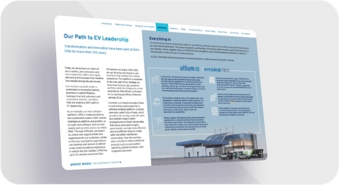 Image is computer generated Our Path to EV Leadership Transformation and innovation have been part of GM’s DNA for more than 100 years. Today, as we pursue our vision of zero crashes, zero emissions and zero congestion, GM is once again delivering technologies that redefine how people and goods are moved. Our business growth model is predicated on leveraging leading positions in electrification, hydrogen fuel cell, autonomy and connected vehicles—positions that are enabling GM's path to EV leadership. As an example, our new software platform, Ultifi, is made possible by the investments made in GM’s vehicle intelligence platform and position us to scale new software, and services rapidly and securely across our entire fleet. Through software, we expect to unlock new opportunities and experiences for our customers, similar to the way smartphone applications use cameras and sensors to deliver a new communications experience. A vehicle like the Cadillac LYRIQ has up to 15 cameras and more than 100 sensors on board. With Ultifi, we can develop new features and functions that redefine the vehicle experience. This platform is expected to be a key part of our strategy to keep improving our gas-powered portfolio while also helping to create experiences that attract customers to our growing portfolio of electric vehicles (EVs). Currently our Global Innovation Team is conducting a pilot project for a software-enabled platform, currently internally called Future Roads, which provides risk scoring, crash hot spots and seatbelt usage insights leveraging anonymized vehicle data. With these actionable insights, governments can take more effective and cost-efficient steps to create safer and better maintained communities. Over the next few years, we plan to release additional products such as road weather reporting, pothole locations, road roughness and more. Everything In Our advanced propulsion technology platforms present the potential to electrify everything—going well beyond today’s on-road vehicle application. The unique modularity and flexibility of the Ultium platform opens opportunities beyond our own vehicles. Ultium, together with our HYDROTEC fuel cell platform, gives GM the potential to transform a variety of transportation modes into zero-emission products. In 2021, GM made the following moves to extend all-electric solutions beyond automotive vehicles: In early 2022, GM announced plans for multiple HYDROTEC fuel cell-based power generators that provide mobile DC fast charging capability for EVs without imposing on the grid. These HYDROTEC fuel cell generators could ultimately replace gas- and diesel-burning generators with zero-emissions technology in a variety of places, as well as provide backup power during power disruptions. GM has taken a strategic stake in Pure Watercraft, which specializes in creating all-electric boating solutions. The collaboration is expected to leverage Pure Watercraft’s innovative marine propulsion technology and experience in the commercial marine industry with GM’s battery technology, engineering, supply chain and manufacturing capabilities. GM and Liebherr Aerospace signed a joint development agreement to co-develop hydrogen fuel cell-powered aeronautics technology. The companies are expected to work toward the creation of an electrical power generation system that demonstrates how hydrogen fuel cell-based power systems could be used in aircrafts. We have an agreement to supply HYDROTEC fuel cell power cubes to Navistar for use in its production model fuel cell electric vehicle (FCEV)—the International ® RH™ Series. The FCEV is expected to receive energy from two GM HYDROTEC fuel cell power cubes. GM and Lockheed Martin entered an agreement to develop a Lunar Mobility Vehicle to enable astronauts to explore the lunar surface farther than ever before as part of NASA’s Artemis program to send humans back to the moon. GM and Wabtec Corporation have entered into a nonbinding memorandum of understanding to leverage our Ultium battery and HYDROTEC fuel cell technologies for Wabtec locomotives. Skip Navigation Introduction Reducing Emissions Design for Environment Technology Customers Safety Diverse Workforce Human Rights Supply Chain Communities Governance 2021 SUSTAINABILITY REPORT 41