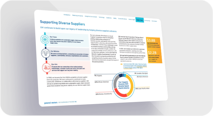 → Supporting Diverse Suppliers GM continues to build upon our legacy of leadership by helping diverse suppliers advance. In 1968, we became the first OEM to establish a formal supplier diversity program. We have continued to contribute to many community initiatives in collaboration with diverse suppliers. GM strives to achieve equitable and sustainable supply chain inclusion goals that establish long-term viability for our diverse supply base. For over a decade, GM utilized our annual Supplier Connections event to strengthen existing relationships, enhance our business acumen and identify new sourcing opportunities, which has attracted thousands of attendees. COVID-19 has challenged us and our diverse business communities, driving us to stay connected virtually in 2021. We supported multiple virtual conferences with our advocacy partners, such as the National Minority Supplier Development Council, as they focused on preparing, positioning and propelling minority business owners to the next level of achievement, despite the impact of the global pandemic. GM received Top Corporation Platinum Award Winner by the Women’s Business Enterprise National Council— their highest distinction for corporations that have demonstrated a sustained commitment to the inclusion of women-owned businesses in their supply chains. In 2021, we invested over $250,000 in technical assistance programs, reaching more than 100 diverse businesses through key partnerships. GM was the first automaker to join the National Gay & Lesbian Chamber of Commerce, which supports and certifies LGBTQ+ owned and operated businesses. 39% Asian Pacific/Indian 26% Women, Nonminority 22% African American 7% Hispanic 3% Canadian Aboriginal 3% Native American Our Vision Achieve equitable and sustainable supply chain inclusion goals that ensure long-term viability for our diverse supply base. Our Mission We serve as bridge builders, connecting an ecosystem of diverse suppliers, communities, advocacy organizations and customers. Our Aim To ensure that our connections drive lasting business relationships, customer loyalty and world-class parts and services that support our long-term viability. $3.8B Approximate spend with North America diverse Tier I suppliers for direct materials $2.2B Approximate spend with North America diverse Tier II suppliers for direct materials Learn more about GM’s robust Diversity, Equity & Inclusion program in the Developing Talented & Diverse People section of this report. Skip Navigation Introduction Reducing Emissions Design for Environment Technology Customers Safety Diverse Workforce Human Rights Supply Chain Communities Governance 2021 SUSTAINABILITY REPORT 95