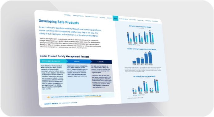 → Developing Safe Products As we continue to transform mobility through new technology platforms, we are committed to incorporating safety every step of the way. The safety of our employees and customers is of the utmost importance. Decision-making for safety issues includes executives at the highest levels of the company and engages employees at every level to identify potential vehicle safety issues. The vice president of global product safety and systems leads the product safety organization and is accountable for developing GM’s vehicle safety systems, confirming and validating our vehicle safety performance, identifying emerging issues and conducting field actions, including recalls. Global Product Safety Management Process INVESTIGATE & ANALYZE Robust teams of internal product investigators and safety forensic engineers help identify and investigate potential vehicle safety issues. A data analytics team merges multiple inputs—such as Speak Up For Safety submissions and dealer service records—to build a unique, comprehensive database. Through statistical analysis and machine learning models, potential issues are identified early by linking key information from disparate data sources. REVIEW Appropriate levels of management, up to senior leadership, review issues. When a decision is made for a recall, a cross-functional team initiates all necessary actions to inform appropriate government agencies, dealers and customers. EXECUTE The team supplies a remedy to the customer free of charge and provides follow-up communication to customers to encourage them to get the repair. Completion rates are monitored and shared where appropriate with government agencies. Meanwhile, Global Product Safety and Systems improves cross-system integration and addresses functional safety and compliance in the vehicle development process. GM Safety & Noncompliance Recalls (Number of Recalls) Number of Global Recalls with <10,000 Vehicles Global recalls that involve fewer than 10,000 vehicles are one way we measure the effectiveness of our safety quality management process. The ability to catch more issues early—with a relatively low volume of vehicles affected—and act swiftly is positive. The data above is also included in the total vehicle volume of safety and noncompliance recalls. GM Safety & Noncompliance Recalls (Vehicle Volume in Millions) 2020 2021 1 2019 2018 2017 1.8 1.6 8.6 7.3 4.2 2.2 2.1 1.4 9.7 9.3 Global North America 1 Includes 7M Takata airbag-related recalls. Learn more about our product development process in Earning Customers for Life . Skip Navigation Introduction Reducing Emissions Design for Environment Technology Customers Safety Diverse Workforce Human Rights Supply Chain Communities Governance 2021 SUSTAINABILITY REPORT 54