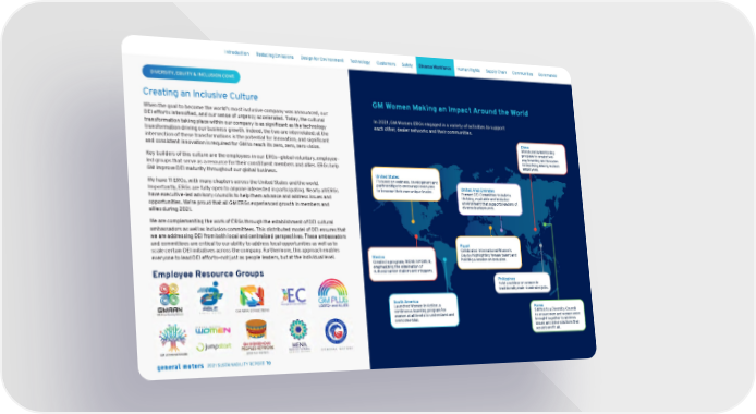 DIVERSITY, EQUITY & INCLUSION CONT. Creating an Inclusive Culture When the goal to become the world’s most inclusive company was announced, our DEI efforts intensified, and our sense of urgency accelerated. Today, the cultural transformation taking place within our company is as significant as the technology transformation driving our business growth. Indeed, the two are interrelated; at the intersection of these transformations is the potential for innovation, and significant and consistent innovation is required for GM to reach its zero, zero, zero vision. Key builders of this culture are the employees in our ERGs—global voluntary, employee- led groups that serve as a resource for their constituent members and allies. ERGs help GM improve DEI maturity throughout our global business. We have 11 ERGs, with many chapters across the United States and the world. Importantly, ERGs are fully open to anyone interested in participating. Nearly all ERGs have executive-led advisory councils to help them advance and address issues and opportunities. We’re proud that all GM ERGs experienced growth in members and allies during 2021. We are complementing the work of ERGs through the establishment of DEI cultural ambassadors as well as inclusion committees. This distributed model of DEI ensures that we are addressing DEI from both local and centralized perspectives. These ambassadors and committees are critical to our ability to address local opportunities as well as to scale certain DEI initiatives across the company. Furthermore, this approach enables everyone to lead DEI efforts—not just as people leaders, but at the individual level. GM Women Making an Impact Around the World In 2021, GM Women ERGs engaged in a variety of activities to support each other, dealer networks and their communities. United States Focused on wellness, development and partnerships to encourage everyone to become their own unique leader. Mexico Created a program, WOMENPOWER, emphasizing the elimination of cultural career stallers and stoppers. South America Launched Women in Action, a continuous learning program for women at all levels to understand and overcome bias. United Arab Emirates Formed DEI Committee to build a thriving, equitable and inclusive environment that supports leaders of diverse backgrounds. Egypt Celebrated International Women’s Day by highlighting female talent and holding a session on inclusion. Philippines Held a webinar on women in traditionally male-dominated jobs. Korea Shifted to a Diversity Council to ensure men and women were brought together to address issues and drive solutions that would benefit all. China Introduced a mentoring program to create two- way learning and broaden networking among women employees. Employee Resource Groups Skip Navigation Introduction Reducing Emissions Design for Environment Technology Customers Safety Diverse Workforce Human Rights Supply Chain Communities Governance 2021 SUSTAINABILITY REPORT 70