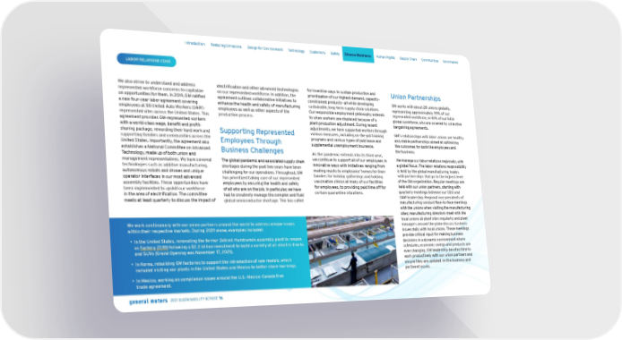 LABOR RELATIONS CONT. We also strive to understand and address represented workforce concerns to capitalize on opportunities for them. In 2019, GM ratified a new four-year labor agreement covering employees at 55 United Auto Workers (UAW)- represented sites across the United States. This agreement provides GM-represented workers with a world-class wage, benefit and profit- sharing package, rewarding their hard work and supporting families and communities across the United States. Importantly, the agreement also establishes a National Committee on Advanced Technology, made up of both union and management representatives. We have covered technologies such as additive manufacturing, autonomous robots and drones and unique operator interfaces in our most advanced assembly facilities. These opportunities have been implemented to upskill our workforce in the area of electrification. The committee meets at least quarterly to discuss the impact of electrification and other advanced technologies on our represented workforce. In addition, the agreement outlines collaborative initiatives to enhance the health and safety of manufacturing employees as well as other aspects of the production process. Supporting Represented Employees Through Business Challenges The global pandemic and associated supply chain shortages during the past two years have been challenging for our operations. Throughout, GM has prioritized taking care of our represented employees by ensuring the health and safety of all who are on the job. In particular, we have had to creatively manage the complex and fluid global semiconductor shortage. This has called for inventive ways to sustain production and prioritization of our highest-demand, capacity- constrained products—all while developing sustainable, long-term supply chain solutions. Our responsible employment philosophy extends to when workers are displaced because of a plant production adjustment. During recent adjustments, we have supported workers through various measures, including on-the-job training programs and various types of paid leave and supplemental unemployment insurance. As the pandemic extends into its third year, we continue to support all of our employees in innovative ways with initiatives ranging from mailing masks to employees’ homes for their families for holiday gatherings and holding vaccination clinics at many of our facilities for employees, to providing paid time off for certain quarantine situations. Union Partnerships GM works with about 28 unions globally, representing approximately 99% of our represented workforce, or 61% of our total global workforce, who are covered by collective bargaining agreements. GM’s relationships with labor unions are healthy and stable partnerships aimed at optimizing the outcomes for both the employees and the business. We manage our labor relations regionally, with a global focus. The labor relations responsibility is held by the global manufacturing leader, with partnerships that go to the highest level of the GM organization. Regular meetings are held with our union partners, starting with quarterly meetings between our CEO and UAW leadership. Regional vice presidents of manufacturing conduct face-to-face meetings with the unions when visiting the manufacturing sites; manufacturing directors meet with the local unions at plant sites regularly; and plant managers around the globe discuss business issues daily with local unions. These meetings provide critical input for making business decisions in a dynamic environment where schedules, economic swings and products are ever changing. GM leadership devotes time to work productively with our union partners and ensure they are updated on the business and pertinent issues. We work continuously with our union partners around the world to address unique issues within their respective markets. During 2021 alone, examples included: • In the United States, renovating the former Detroit-Hamtramck assembly plant to reopen as Factor y ZERO following a $2.2 billion investment to build a variety of all-electric trucks and SUVs (Grand Opening was November 17, 2021). • In Korea, rebuilding GM factories to support the introduction of new models, which included visiting our plants in the United States and Mexico to better share learnings. • In Mexico, working on compliance issues around the U.S.-Mexico-Canada free trade agreement. Skip Navigation Introduction Reducing Emissions Design for Environment Technology Customers Safety Diverse Workforce Human Rights Supply Chain Communities Governance 2021 SUSTAINABILITY REPORT 76