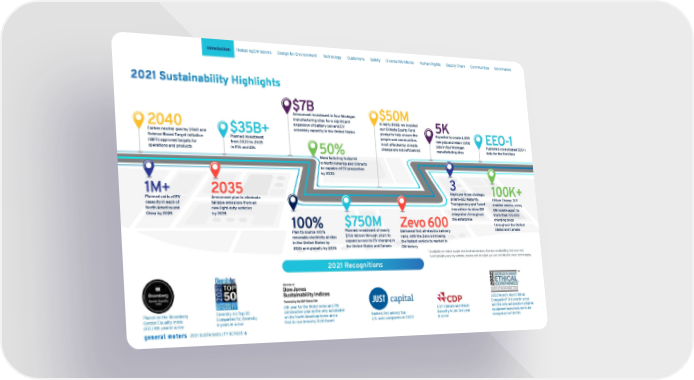 2021 Sustainability Highlights 2040 Carbon neutral goal by 2040 and Science Based Target initiative (SBTi) approved targets for operations and products 1M+ Planned units of EV capacity in each of North America and China by 2025 $35B+ Planned investment from 2020 to 2025 in EVs and AVs 2035 Announced plan to eliminate tailpipe emissions from all new light-duty vehicles by 2035 $7B Announced investment in four Michigan manufacturing sites for a significant expansion of battery cell and EV assembly capacity in the United States 50% Manufacturing footprint in North America and China to be capable of EV production by 2030 100% Plan to source 100% renewable electricity at sites in the United States by 2025 and globally by 2035 $750M Planned investment of nearly $750 million through 2025 to expand access to EV charging in the United States and Canada $50M In early 2022, we doubled our Climate Equity Fund pledge to help ensure the people and communities most affected by climate change are not left behind Zevo 600 Delivered first all-electric delivery vans, with the Zevo 600 being the fastest vehicle to market in GM history 5K Expected to create 4,000 new jobs and retain 1,000 jobs in four Michigan manufacturing sites 3 Deployed three strategic pillars—DEI Maturity, Transparency and Talent Innovation—to drive DEI integration throughout the enterprise EEO-1 Published consolidated EEO-1 data for the first time 100K+ Ultium Charge 360 enables access, using GM mobile apps 1 , to more than 100,000 charging plugs throughout the United States and Canada 1 A vailable on select Apple and Android devices. Service availability, features and functionality vary by vehicle, device and the plan you are enrolled in. User terms apply. 2021 Recognitions Placed on the Bloomberg Gender Equality Index (GEI) 4th year in a row Diversity Inc Top 50 Companies for Diversity 6 years in a row 5th year for the World Index and 7th consecutive year as the only automaker on the North American index and a first-in-our-industry Gold Award Ranked 2nd among top U.S. auto companies in 2022 CDP Climate and Water Security A List 3rd year in a row 2022 World’s Most Ethical Companies ® 3rd year in a row and the only automotive original equipment manufacturer to be recognized on the list Skip Navigation Introduction Reducing Emissions Design for Environment Technology Customers Safety Diverse Workforce Human Rights Supply Chain Communities Governance 2021 SUSTAINABILITY REPORT 6