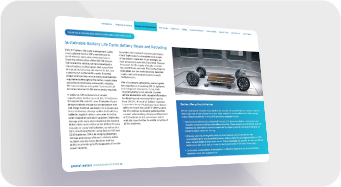 SOURCING SUSTAINABLE MATERIALS CONT. SOURCING & ENGINEERING MORE SUSTAINABLE MATERIALS CONT. Sustainable Battery Life Cycle: Battery Reuse and Recycling GM’s EV battery life cycle management (LCM) is a crucial element in GM’s commitment to an all-electric and a zero-emissions future. Since the introduction of the GM Volt plug-in hybrid electric vehicle, we have developed a robust battery LCM program that spans from design, manufacturing and service to EoL and supports our sustainability goals. Ensuring proper LCM can help reduce energy and materials requirements throughout the battery supply chain and is key to minimizing sustainability impacts. We have created an ecosystem that ensures all batteries returned to GM are reused or recycled. In addition, GM continues to evaluate opportunities for the reuse of EoL EV batteries for second life, non-EV uses. Examples of past demonstrations include our collaboration with Oak Ridge National Laboratory to evaluate and test a stationary storage system built with EoL batteries against various use cases including solar integration and back-up power. Stationary storage units were also installed at the General Motors data center office at the Milford Proving Grounds re-using Volt batteries, as well as at a SAIC-GM-Wuling facility using Baojun E100 and E200 batteries. GM is developing stationary storage and energy-efficient solutions within multiple manufacturing facilities with the ability to provide up to 15 megawatts of on-site power capacity. In parallel, GM’s Global Purchasing and Supply Chain Team seeks to strengthen local supply of raw battery materials. As an example, we have announced work with Controlled Thermal Resources for the supply of locally sourced, low-cost lithium, and with POSCO chemicals to strengthen our own cathode active materials supply chain and localize its processing to North America. When it comes to vehicle EoL, we recognize the importance of enabling GM EV batteries to be disposed of properly. Today, GM’s recyclemybattery.com website provides vehicle dismantlers with valuable information for disabling and removing battery packs from GM EVs. A list of EV battery recyclers is provided along with information on how to safely store and ship used EV battery packs. We will continue to develop guidelines that support safe handling, storage and transport of EV batteries by EoL processors and to evaluate opportunities to enable recycling of all EoL batteries. Battery Recycling Initiatives We will continue to evaluate opportunities for second-life use of batteries. However, battery recycling is our primary focus today and a key enabler to more sustainable battery supply chains. Recycling efforts in which GM is actively engaged include: • Collaboration with the Department of Energy’s U.S. Advanced Battery Consortium and recyclers to advance lithium-ion battery recycling. These projects are validating recycled materials as alternatives to mined materials for battery manufacturing with the goal of reducing future needs for mining. • Strategic sourcing of recycled materials from multiple companies utilizes new hydrometallurgical processes that produce battery materials with approximately a 30% lower carbon footprint than when mined. These processes are used for all returned GM EV batteries as well as all battery material waste generated at GM and Ultium plants. • Continuous collaborations with suppliers in effective ways of using recycled battery materials in our own supply chain. Skip Navigation Introduction Reducing Emissions Design for Environment Technology Customers Safety Diverse Workforce Human Rights Supply Chain Communities Governance 2021 SUSTAINABILITY REPORT 34