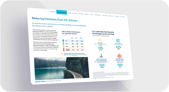 Learn more about fuel efficiency and emissions regulation in the Public Policy section of this report. → Reducing Emissions From ICE Vehicles As we move closer to our vision of an all-electric portfolio, we also are improving the efficiency of ICE vehicles. Continual improvements in vehicle engine and transmission efficiency, as well as vehicle weight, have helped us to eliminate excess materials use in manufacturing, while reducing fuel use and costs for customers. For example, the 4WD Crew Cab Silverado has seen an improvement in tailpipe CO2 emissions of 25% from 2000 through 2020. 3 Within GM, we have institutionalized extensive governance processes that predict, plan, measure and assess our fleet’s fuel efficiency and emissions performance according to established government test procedures on a dynamic and country-by-country basis. Well-to-Wheel CO2 Emissions per Light-Duty Vehicle 1, 2 (gCO2e/km) 2018 2019 2020 USA 287 293 280 China 220 208 206 Brazil 200 198 195 Weighted Average 245 243 240 U.S. Light-Duty Fuel Economy Technologies Across the Fleet Percent of Total U.S. Light-Duty Volume Stop-Start (reduces fuel usage when the vehicle is stopped) 74% MY21 Engine/Transmission Thermal Management (warms up engine and transmission faster to reduce friction and losses) 56% MY21 Aero-Shutter (reduces aerodynamic drag) 83% MY21 High-Efficiency Alternators (72%+) (reduce losses from electricity generation) 88% MY21 1 2 021 data will be available mid-2022. 2 D ata has been restated to align with SBTi for Scope 3, Use of Sold Products. The SBTi standards require well-to-wheel (from fuel production to vehicle driving) for vehicle CO2 intensity (gCO2e/km) calculations. We have revised our numbers for 2018 through 2020 for this requirement. Going forward, GM will use the SBTi standards in calculating vehicle CO2 intensity. Numbers are inclusive of EV portfolio. 3 D ata prior to July 2009 corresponds to General Motors Corporation. Skip Navigation Introduction Reducing Emissions Design for Environment Technology Customers Safety Diverse Workforce Human Rights Supply Chain Communities Governance 2021 SUSTAINABILITY REPORT 24