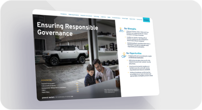 Ensuring Responsible Governance Our Strengths y Using our Purpose, Vision, Values and Core Behaviors as a guide for how we conduct ourselves in all areas of business y Leading our industry regarding ethical business practices as one of Ethisphere’s World’s Most Ethical Companies ® y Maintaining Board committees that enhance the Board’s oversight of corporate social responsibility and sustainability Our Opportunities y Engaging with and incorporating the insights of institutional shareholders y Addressing emerging cybersecurity risks related to business and customer security and privacy y Ensuring environmental compliance at facilities across the world with varying requirements and resource constraints y Holding all employees and third parties accountable to our Code of Conduct and appropriately investigating concerns raised IN THIS SECTION Corporate Governance 105 Cybersecurity & Privacy 109 Environmental Management & Compliance 111 Ethics 114 Public Policy 118 Edition 1 Pickup limited availability by waitlist. Additional GMC HUMMER EV models available Fall 2022. Skip Navigation Introduction Reducing Emissions Design for Environment Technology Customers Safety Diverse Workforce Human Rights Supply Chain Communities Governance 2021 SUSTAINABILITY REPORT 104