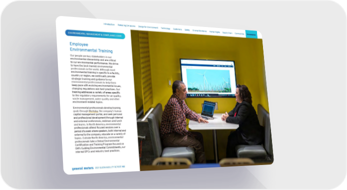 ENVIRONMENTAL MANAGEMENT & COMPLIANCE CONT. Employee Environmental Training Our people are key stakeholders in our environmental stewardship and are critical to our environmental performance. We strive to have the best-trained environmental professionals in the world. Although most environmental training is specific to a facility, country or region, we continually provide strategic training and guidance to our environmental professionals to help them keep pace with evolving environmental issues, changing regulations and best practices. Our training addresses a variety of areas specific to the regulatory requirements for air quality, waste management, water quality and other environment-related topics. Environmental professionals develop training goals through Workday , the company’s human capital management portal, and seek personal and professional development through internal and external conferences, webinars and lunch and learns. In North America, environmental professionals attend focused sessions over a period of a week where speakers, both internal and external to the company, educate on a variety of topics. Outside North America, environmental professionals take a Global Environmental Certification and Training Program focused on GM’s Guiding Environmental Commitments, our internal EPCs and industry best practices. Skip Navigation Introduction Reducing Emissions Design for Environment Technology Customers Safety Diverse Workforce Human Rights Supply Chain Communities Governance 2021 SUSTAINABILITY REPORT 113