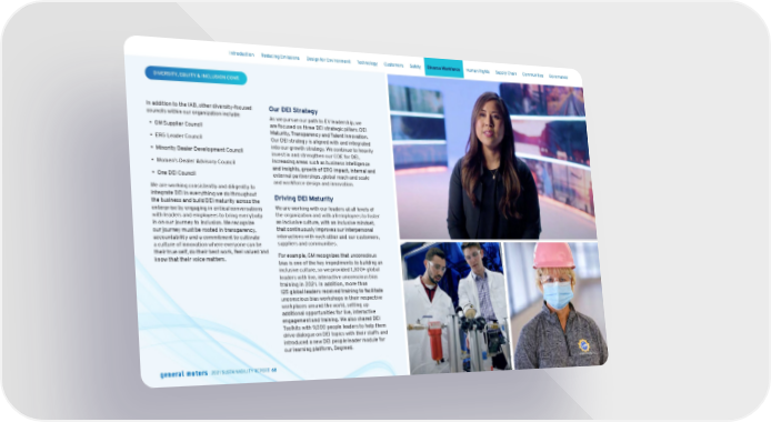 In addition to the IAB, other diversity-focused councils within our organization include: • GM Supplier Council • ERG Leader Council • Minority Dealer Development Council • Women’s Dealer Advisory Council • One DEI Council We are working consistently and diligently to integrate DEI in everything we do throughout the business and build DEI maturity across the enterprise by engaging in critical conversations with leaders and employees to bring everybody in on our journey to inclusion. We recognize our journey must be rooted in transparency, accountability and a commitment to cultivate a culture of innovation where everyone can be their true self, do their best work, feel valued and know that their voice matters. Our DEI Strategy As we pursue our path to EV leadership, we are focused on three DEI strategic pillars: DEI Maturity, Transparency and Talent Innovation. Our DEI strategy is aligned with and integrated into our growth strategy. We continue to heavily invest in and strengthen our COE for DEI, increasing areas such as business intelligence and insights, growth of ERG impact, internal and external partnerships, global reach and scale and workforce design and innovation. Driving DEI Maturity We are working with our leaders at all levels of the organization and with all employees to foster an inclusive culture, with an inclusive mindset, that continuously improves our interpersonal interactions with each other and our customers, suppliers and communities. For example, GM recognizes that unconscious bias is one of the key impediments to building an inclusive culture, so we provided 1,300+ global leaders with live, interactive unconscious bias training in 2021. In addition, more than 125 global leaders received training to facilitate unconscious bias workshops in their respective workplaces around the world, setting up additional opportunities for live, interactive engagement and training. We also shared DEI Toolkits with 9,000 people leaders to help them drive dialogue on DEI topics with their staffs and introduced a new DEI people leader module for our learning platform, Degreed. Skip Navigation Introduction Reducing Emissions Design for Environment Technology Customers Safety Diverse Workforce Human Rights Supply Chain Communities Governance DIVERSITY, EQUITY & INCLUSION CONT. 2021 SUSTAINABILITY REPORT 68