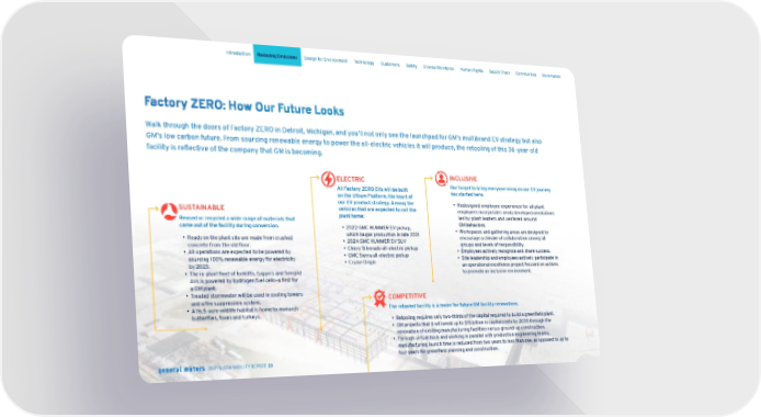 Factory ZERO: How Our Future Looks Walk through the doors of Factory ZERO in Detroit, Michigan, and you’ll not only see the launchpad for GM’s multibrand EV strategy but also GM’s low carbon future. From sourcing renewable energy to power the all-electric vehicles it will produce, the retooling of this 36-year-old facility is reflective of the company that GM is becoming. SUSTAINABLE Reused or recycled a wide range of materials that came out of the facility during conversion. • Roads on the plant site are made from crushed concrete from the old floor. • All operations are expected to be powered by sourcing 100% renewable energy for electricity by 2023. • The in-plant fleet of forklifts, tuggers and Seegrid AVs is powered by hydrogen fuel cells–a first for a GM plant. • Treated stormwater will be used in cooling towers and a fire suppression system. • A 16.5-acre wildlife habitat is home to monarch butterflies, foxes and turkeys. ELECTRIC All Factory ZERO EVs will be built on the Ultium Platform, the heart of our EV product strategy. Among the vehicles that are expected to call the plant home: • 2022 GMC HUMMER EV pickup, which began production in late 2021 • 2024 GMC HUMMER EV SUV • Chevy Silverado all-electric pickup • GMC Sierra all-electric pickup • Cruise Origin INCLUSIVE Our target to bring everyone along on our EV journey has started here. • Redesigned employee experience for all plant employees incorporates newly developed orientations led by plant leaders and centered around GM behaviors. • Workspaces and gathering areas are designed to encourage a climate of collaboration among all groups and levels of responsibility. • Employees actively recognize and share success. • Site leadership and employees actively participate in an operational excellence project focused on actions to promote an inclusive environment. COMPETITIVE The retooled facility is a model for future GM facility renovations. • Retooling requires only two-thirds of the capital required to build a greenfield plant. • GM projects that it will avoid up to $15 billion in capital costs by 2030 through the renovation of existing manufacturing facilities versus ground-up construction. • Through virtual tools and working in parallel with production engineering teams, manufacturing launch time is reduced from two years to less than one, as opposed to up to four years for greenfield planning and construction. Skip Navigation Introduction Reducing Emissions Design for Environment Technology Customers Safety Diverse Workforce Human Rights Supply Chain Communities Governance 2021 SUSTAINABILITY REPORT 23