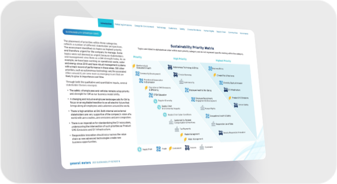 SUSTAINABILITY STRATEGY CONT. The placement of priorities within three categories reflects a number of different stakeholder perspectives. The assessment identified six topics as highest priority and therefore urgent for the company to manage. Some topics were not deemed as urgent because stakeholders and management view them as a GM strength today. As an example, we have been working on operational waste, water and energy since 2010 and have robust management systems with a track record of performance in these areas. Still other priorities, such as autonomous technology and the associated ethics around it, are seen more as emerging issues that are likely to grow in importance over time. Through both the qualitative and quantitative inputs, several stakeholder themes emerged: • The safety of employees and vehicles remains a top priority and strength for GM as our business model shifts. • A changing and inclusive employee landscape calls for GM to focus on an equitable transition to an all-electric future that brings along all employees and customers around the world. • There is high ambition at GM. Both internal and external stakeholders are very supportive of the company’s vision of a world with zero crashes, zero emissions and zero congestion. • There is an imperative for standardizing the EV ecosystem, underscoring the intersection of such priorities as Product GHG Emissions and EV Infrastructure. • Responsible innovation should occur across the value chain as new advanced technologies create new business opportunities. Sustainability Priority Matrix Topics are listed in alphabetical order within each priority category and do not represent specific ranking within the category. Priority Biodiversity & Ecosystem Health Community Development Freedom of Association & Expression Operational GHG Emissions & Efficiency STEM Education Supplier Diversity Supply Chain Environmental Impacts Supply Chain Labor Conditions Sustainability-Related Compensation & Incentives Tax Payments Waste Management Water Management High Priority Autonomous Technology & Ethics Circular Economy Cybersecurity Employee Health & Well-Being Employee Recruitment, Engagement & Development Human Rights Occupational Health & Safety Responsible Use of Data Socially Responsible Innovation Highest Priority Business Ethics Climate Risk & Resilience Diversity, Equity & Inclusion EV Infrastructure Product GHG Emissions Vehicle Safety Supply Chain People Environment Products Governance Skip Navigation Introduction Reducing Emissions Design for Environment Technology Customers Safety Diverse Workforce Human Rights Supply Chain Communities Governance 2021 SUSTAINABILITY REPORT 9