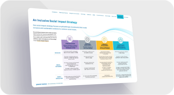 An Inclusive Social Impact Strategy Our social impact strategy focuses on philanthropic investments that create inclusive and sustainable solutions to common social issues. We prioritize programs that create equitable opportunities for minority populations. Our social impact framework encompasses four focus areas with outcomes that we strive to achieve. Learn more about our focus areas in our Social Impact Report . STEM EDUCATION Advance Education in Science Technology, Engineering and Mathematics (STEM) VEHICLE & ROAD SAFETY Fuel Safer Practices in and Around Vehicles COMMUNITY DEVELOPMENT Improve Neighborhoods and Empower Residents CLIMATE EQUITY Equitable Access to a More Sustainable Future INDICATOR # of students with employable labor skills for careers in STEM # of vehicle-related injuries and deaths reduced # of individuals whose socioeconomic opportunity is improving # of closed equity gaps related to climate change SOCIAL OUTCOMES Increase in students who earn a degree in STEM that matches market needs Increase seat belt and restraint usage Increase basic literacy, essential technical skills and living wage employment opportunities Increase in number of people qualified for clean energy careers Increase presence, achievement and persistence for underrepresented minorities in STEM fields Decrease impaired and distracted driving Increase access to necessities, including food, housing, transportation and financial education Increase in awareness and/or access to sustainable transportation solutions Increase number of qualified teachers trained in STEM subjects Increase in awareness of safe road environments Increase in innovative and collaborative community improvements Increase in programs that mitigate the effects of climate change, assist with climate adaptation and/or community resilience TARGET POPULATION K-12th grade and college students with an emphasis on women and minorities All road users with an emphasis on children and teens Individuals in underserved communities Individuals in underserved communities with emphasis on Black, Indigenous and people of color (BIPOC) Skip Navigation Introduction Reducing Emissions Design for Environment Technology Customers Safety Diverse Workforce Human Rights Supply Chain Communities Governance 2021 SUSTAINABILITY REPORT 99