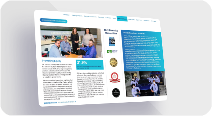 GM’s HR and leadership team in South America announce final candidate selections. DIVERSITY, EQUITY & INCLUSION CONT. Promoting Equity GM has long been a global leader in advocating for women’s equity in the workplace. In 2021, women were in 31.9% of our top management positions within two levels of the CEO. The Bloomberg Gender-Equality Index is among the organizations that have recognized GM as a leader in gender equity. We are committed to equal pay practices. Our commitment to the Equal Pay Pledge reflects the value we place on gender pay equity and our shared belief that employees’ protected characteristics, including gender, should not factor into compensation decisions. As part of this commitment, GM has a rigorous annual process that involves measuring pay equity and making adjustments whenever unaccounted-for discrepancies are found. GM has a strong antidiscrimination policy that extends to all groups. We believe everyone deserves to work in an environment where they can be proud of who they are. GM ERGs help guide our strategy and understanding of important issues surrounding equity. GM Plus, our ERG focused on LGBTQ+ employees, for example, encourages allyship as one of the ways people can support the LGBTQ+ community, with about half of its over 1,000 members identifying as allies. In addition, the president of the GM Able ERG leads our disability advisory council. Diverse Recruitment Successes During 2021, we took a number of actions to increase diversity within our workforce. When we restarted our Oshawa Assembly plant in Ontario, we recognized the opportunity to rebuild our approximately 1,200-person workforce to achieve gender parity. Through a recruitment process that helped to eliminate gender bias, the plant was able to re-open with women making up roughly half of the new workforce. Similarly, GM Brazil held a successful Technical Rotation and Career Knowledge (TRACK) program aimed at accelerating inclusion of Black professionals in our workforce, especially in leadership positions. The TRACK program is GM’s talent pipeline for future leaders. More than 5,700 candidates applied initially. Candidates went through a three-month multiphased process that ranged from online assessments to an everybody in session with GM leaders. Ultimately, 16 professionals—seven of whom were female—joined the GM Brazil team, with backgrounds ranging from engineering to psychology. The project concluded with onboarding activities at GM’s plant in São Caetano. 31.9% women in top management positions within two levels of the CEO 2021 Diversity Recognition Skip Navigation Introduction Reducing Emissions Design for Environment Technology Customers Safety Diverse Workforce Human Rights Supply Chain Communities Governance 2021 SUSTAINABILITY REPORT 71
