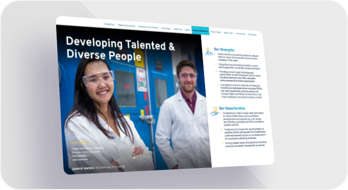 Developing Talented & Diverse People IN THIS SECTION A Team That Includes Everybody 64 Diversity, Equity & Inclusion 67 Total Rewards 73 Labor Relations 75 Our Strengths y Global workforce practicing behaviors aligned with our vision to become the most inclusive company in the world y Integrating new technology to better connect and engage with current and prospective talent y Providing a broad range of development opportunities to meet employees’ diverse needs, including training for new skills, education reimbursement and stretch assignments y Leveraging our diverse network of employees, including our employee resource groups (ERGs) and newly established diversity, equity and inclusion (DEI) committees to help attract and retain employees and achieve business results Our Opportunities y Competing for highly sought-after tech talent in critical skilled areas such as software development and engineering, user design and interface and advanced driver assistance systems (ADAS) y Continuing to increase the representation of qualified women and people from traditionally underrepresented groups on our teams and in our succession planning processes y Driving greater equity throughout our business practices and talent management processes Skip Navigation Introduction Reducing Emissions Design for Environment Technology Customers Safety Diverse Workforce Human Rights Supply Chain Communities Governance 2021 SUSTAINABILITY REPORT 63