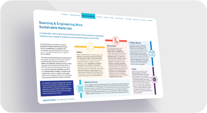 Sourcing & Engineering More Sustainable Materials A sustainable vehicle goes beyond being electric and incorporates responsible materials and a design to minimize environmental impact at end-of-life. As we transform our business to support production of electric vehicles (EVs), we are not only considering EoL reusability and recyclability but also working to ensure the use of sustainable materials in our vehicles from inception. This will be accomplished through a comprehensive commodity management plan, which includes purchased steel, aluminum, plastics, EV battery cell materials, textiles and more. These materials—that represent more than 90% of the CO2 emissions generated by materials in our vehicles—have been identified as part of our implementation strategy. The plan drives collaboration with our suppliers and applies data-driven strategies that can be customized to the specific attributes of each commodity. Plastics We are collaborating with our plastics suppliers to advance circular economy practices and support the responsible utilization of resources. Some of their strategies to achieve those commitments include switching to renewable energy for electricity in their manufacturing processes, continued recycling efforts, incorporating biomaterials, improving processes in their own business and utilizing carbon capture technologies and carbon offsets. Our plastics suppliers are working to overcome common challenges in this industry, which include increasing costs, scaling issues and the quality of available feedstocks. Natural Rubber GM is a founding member of the Global Platform for Sustainable Natural Rubber, a multistakeholder initiative whose goal is to transition the natural rubber supply chain to a more sustainable model. The initiative now has more than 100 members, including Original Equipment Manufacturers (OEMs); tire manufacturers; rubber producers, processors and traders; nongovernmental organizations; and smallholder farmers. All members are expected to adopt a sustainability policy framework, which covers economic, social and environmental aspects of sustainability and will help protect ecological health, local livelihoods and fundamental human rights. Steel and Aluminum We are engaging with our direct materials suppliers regarding how to make these materials more sustainable. We expect supplier carbon-emissions reductions to be achieved using process innovation, recycled materials, renewable energy for electricity and carbon capture utilization and storage. GM will work to secure supply of low-CO2 metals and materials ahead of their availability at scale. Beginning in the first quarter of 2022, we became the inaugural customer of a Nucor Corp. line of net-zero carbon steel products called Econiq. EV Battery Materials The EV battery materials commodity management plan uses a combination of supply chain carbon reduction, the incorporation of recycled materials and third-party partnerships to help ensure responsible sourcing. While utilizing critical recycled minerals is a significant focus for GM, the advancement of the EV landscape will continue to depend on the use of raw materials until the EV circular economy reaches maturity. Read more about our work with the Responsible Minerals Initiative on page 93 . Tex tile s Together with our suppliers, we are developing dozens of new textile materials from items such as recycled plastic bottles. We are committed to developing 35% recycled content on seat insert fabrics and 100% recycled yarn for future seat bolster fabrics, overhead fabrics, floor carpets, floor mats and more in our upcoming vehicles. Beyond textiles, we are continually researching new and innovative materials, including bio-based alternatives, lower-impact leather tanning practices and alternatives to chrome plating. Our Materials Commodity Management Plan aims to procure increasingly sustainable materials via carbon emissions reductions through process innovation, recycled material content, renewable and fossil free energy for electricity and carbon capture utilization and storage. Skip Navigation Introduction Reducing Emissions Design for Environment Technology Customers Safety Diverse Workforce Human Rights Supply Chain Communities Governance 2021 SUSTAINABILITY REPORT 32