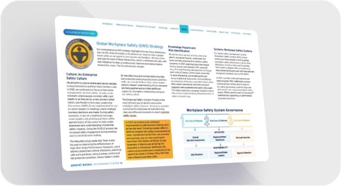 A CULTURE OF SAFETY CONT. Global Workplace Safety (GWS) Strategy Our comprehensive GWS strategy highlights five key focus dimensions, seen at left, that will enable us to achieve our vision to return people home safely as we aspire to zero injuries and fatalities. We have a five- year plan for each of these dimensions, which is refreshed annually with new initiatives to help us continuously improve and make progress toward this vision. The five dimensions include: Culture: An Enterprise Safety Culture We strive for a culture where each person decides to keep themselves and their team members safe. In 2021, we continued our focus on how senior management can lead safety. To help create mindsets where people consider safety and health in all that we do, a new process called Safety and Health In Everyday Leadership Discussions (SHIELD) was implemented for use by senior leaders in meetings where strategic business decisions are made. During safety moments, in lieu of a traditional message, senior leaders ask probing questions within agenda topics of discussion to help create awareness and understanding of potential safety impacts. Using the SHIELD process has increased safety engagement during meetings and in overall decision-making. The Manufacturing Leadership Team is also focused on improving the effectiveness of High-Risk Global Performance Standards, which address pedestrian/vehicle interaction, electrical safe work practices, lockout energy control and fall protection practices. Senior leaders visited 26 manufacturing and nonmanufacturing sites and conducted small group discussions and floor walks. As a result of these visits, senior leaders gained a deeper understanding of how standards are being applied and provided additional support to strengthen relationships and grow our safety culture. The Employee Safety Concern Process is the most efficient way to identify and resolve workplace safety concerns. The process provides a structure for employees at manufacturing sites and office environments to report potential safety issues . Knowledge: Hazard and Risk Identification We aim for every person, at every site, to be able to recognize hazards, understand risk levels and feel empowered to address safety concerns. In 2021, learning topics that impact serious injuries and fatalities (SIF) potential (e.g., Pre-task Planning, Management of Change and Lockout Energy Control) were conducted in more interactive, conversational forums versus traditional classrooms. Overconfidence, normalization of deviance and other biases which often lead to perceptual distortion and poor judgment were explained and openly discussed. This helps employees recognize situations where they may be inadvertently putting themselves or others in harm’s way. Systems: Workplace Safety Systems Our global safety management system, Workplace Safety System (WSS), drives continuous improvement in all five global workplace safety dimensions: Culture, Risk Mitigation, Systems, Data and Knowledge. The system is aligned with our continuous improvement philosophy and with internationally recognized standards such as ISO 45001. In 2021, our sites continued maturing and improving their WSS. Additionally, a cross- functional team collaborated to improve our safety governance system to align and interconnect site, regional and global safety boards. Efforts were focused on reducing SIF potential and supporting our performance assurance processes. In 2021, we emphasized continued improvement on safe decision-making skills at the site level. Following a global effort in 2020 to conduct site culture assessments at major manufacturing facilities, we provided personalized, one-on-one coaching for more than 500 leaders at Ramos Arizpe Assembly in Mexico and at Spring Hill Assembly in Tennessee. Additional site culture assessments were conducted at our powertrain plant in Toledo, Ohio, GM Silao site in Mexico and other sites. Workplace Safety System Governance Skip Navigation Introduction Reducing Emissions Design for Environment Technology Customers Safety Diverse Workforce Human Rights Supply Chain Communities Governance 2021 SUSTAINABILITY REPORT 60