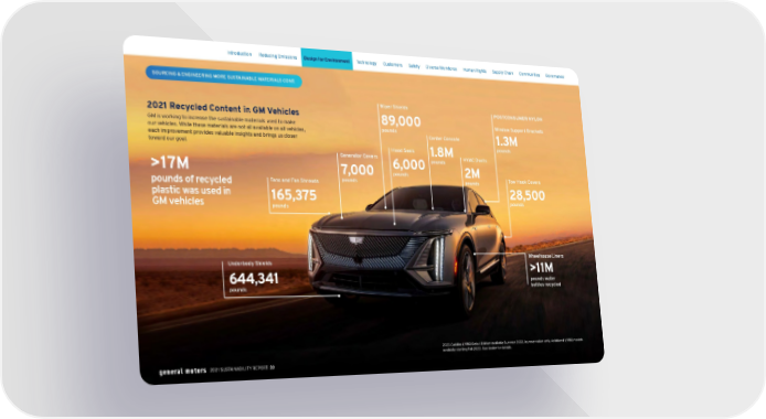 SOURCING & ENGINEERING MORE SUSTAINABLE MATERIALS CONT. 2021 Recycled Content in GM Vehicles GM is working to increase the sustainable materials used to make our vehicles. While these materials are not all available on all vehicles, each improvement provides valuable insights and brings us closer toward our goal. >17M pounds of recycled plastic was used in GM vehicles Fans and Fan Shrouds 165,375 pounds Generator Covers 7,000 pounds Wiper Shields 89,000 pounds Hood Seals 6,000 pounds Center Console 1.8M pounds HVAC Ducts 2M pounds POSTCONSUMER NYLON Window Support Brackets 1.3M pounds Tow Hook Covers 28,500 pounds Underbody Shields 644,341 pounds Wheelhouse Liners >11M pounds water bottles recycled 2023 Cadillac LYRIQ Debut Edition available Summer 2022, by reservation only. Additional LYRIQ models available starting Fall 2022. See dealer for details. Skip Navigation Introduction Reducing Emissions Design for Environment Technology Customers Safety Diverse Workforce Human Rights Supply Chain Communities Governance 2021 SUSTAINABILITY REPORT 33