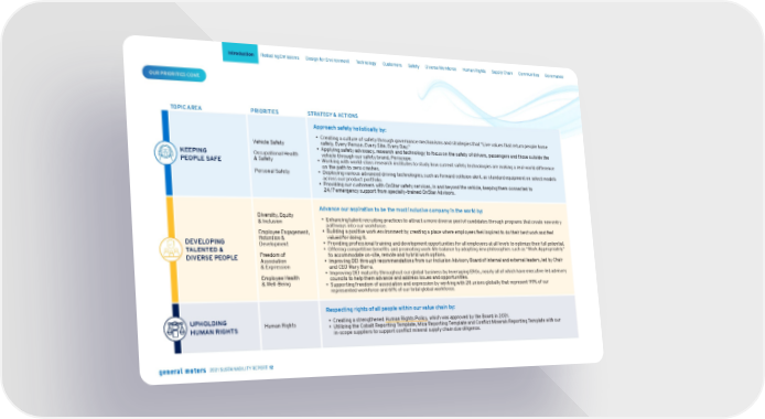 OUR PRIORITIES CONT. TOPIC AREA PRIORITIES STRATEGY & ACTIONS KEEPING PEOPLE SAFE Vehicle Safety Occupational Health & Safety Personal Safety Approach safety holistically by: • Creating a culture of safety through governance mechanisms and strategies that “Live values that return people home safely. Every Person. Every Site. Every Day.” • Applying safety advocacy, research and technology to focus on the safety of drivers, passengers and those outside the vehicle through our safety brand, Periscope. • Working with world-class research institutes to study how current safety technologies are making a real-world difference on the path to zero crashes. • Deploying various advanced driving technologies, such as forward collision alert, as standard equipment on select models across our product portfolio. • Providing our customers with OnStar safety services, in and beyond the vehicle, keeping them connected to 24/7 emergency support from specially-trained OnStar Advisors. DEVELOPING TALENTED & DIVERSE PEOPLE Diversity, Equity & Inclusion Employee Engagement, Retention & Development Freedom of Association & Expression Employee Health & Well-Being Advance our aspiration to be the most inclusive company in the world by: • Enhancing talent recruiting practices to attract a more diverse pool of candidates through programs that create new entry pathways into our workforce. • Building a positive work environment by creating a place where employees feel inspired to do their best work and feel valued for doing it. • Providing professional training and development opportunities for all employees at all levels to optimize their full potential. • Offering competitive benefits and promoting work-life balance by adopting new philosophies such as “Work Appropriately” to accommodate on-site, remote and hybrid work options. • Improving DEI through recommendations from our Inclusion Advisory Board of internal and external leaders, led by Chair and CEO Mary Barra. • Improving DEI maturity throughout our global business by leveraging ERGs, nearly all of which have executive-led advisory councils to help them advance and address issues and opportunities. • Supporting freedom of association and expression by working with 28 unions globally that represent 99% of our represented workforce and 61% of our total global workforce. UPHOLDING HUMAN RIGHTS Human Rights Respecting rights of all people within our value chain by: • Creating a strengthened Human Rights Policy , which was approved by the Board in 2021. • Utilizing the Cobalt Reporting Template, Mica Reporting Template and Conflict Minerals Reporting Template with our in-scope suppliers to support conflict mineral supply chain due diligence. Skip Navigation Introduction Reducing Emissions Design for Environment Technology Customers Safety Diverse Workforce Human Rights Supply Chain Communities Governance 2021 SUSTAINABILITY REPORT 12