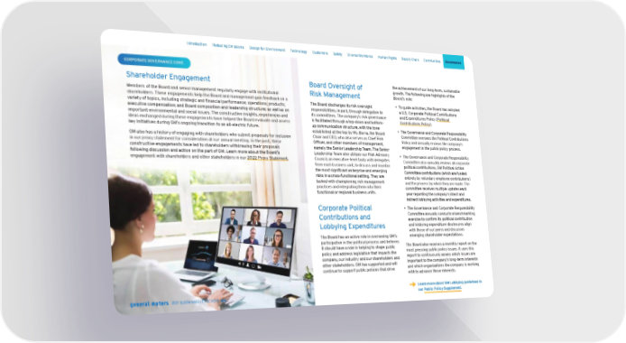 Shareholder Engagement Members of the Board and senior management regularly engage with institutional shareholders. These engagements help the Board and management gain feedback on a variety of topics, including strategic and financial performance; operations; products; executive compensation; and Board composition and leadership structure; as well as on important environmental and social issues. The constructive insights, experiences and ideas exchanged during these engagements have helped the Board evaluate and assess key initiatives during GM’s ongoing transition to an all-electric future. GM also has a history of engaging with shareholders who submit proposals for inclusion in our proxy statement for consideration at our annual meeting. In the past, these constructive engagements have led to shareholders withdrawing their proposals following discussion and action on the part of GM. Learn more about the Board’s engagement with shareholders and other stakeholders in our 2022 Proxy Statement . → CORPORATE GOVERNANCE CONT. Board Oversight of Risk Management The Board discharges its risk oversight responsibilities, in part, through delegation to its committees. The company’s risk governance is facilitated through a top-down and bottom- up communication structure, with the tone established at the top by Ms. Barra, the Board Chair and CEO, who also serves as Chief Risk Officer, and other members of management, namely the Senior Leadership Team. The Senior Leadership Team also utilizes our Risk Advisory Council, an executive-level body with delegates from each business unit, to discuss and monitor the most significant enterprise and emerging risks in a cross-functional setting. They are tasked with championing risk management practices and integrating them into their functional or regional business units. Corporate Political Contributions and Lobbying Expenditures The Board has an active role in overseeing GM’s participation in the political process and believes it should have a role in helping to shape public policy and address legislation that impacts the company, our industry and our shareholders and other stakeholders. GM has supported and will continue to support public policies that drive the achievement of our long-term, sustainable growth. The following are highlights of the Board’s role: • To guide activities, the Board has adopted a U.S. Corporate Political Contributions and Expenditures Policy ( Political Contributions Policy ). • The Governance and Corporate Responsibility Committee oversees the Political Contributions Policy and annually reviews the company’s engagement in the public policy process. • The Governance and Corporate Responsibility Committee also annually reviews all corporate political contributions, GM Political Action Committee contributions (which are funded entirely by voluntary employee contributions) and the process by which they are made. The committee receives multiple updates each year regarding the company’s direct and indirect lobbying activities and expenditures. • The Governance and Corporate Responsibility Committee annually conducts a benchmarking exercise to confirm its political contribution and lobbying expenditure disclosures align with those of our peers and discusses emerging shareholder expectations. The Board also receives a monthly report on the most pressing public policy issues. It uses this report to continuously assess which issues are important to the company’s long-term interests and which organizations the company is working with to advance those interests. Learn more about GM Lobbying guidelines in our Public Policy Supplement . Skip Navigation Introduction Reducing Emissions Design for Environment Technology Customers Safety Diverse Workforce Human Rights Supply Chain Communities Governance 2021 SUSTAINABILITY REPORT 108