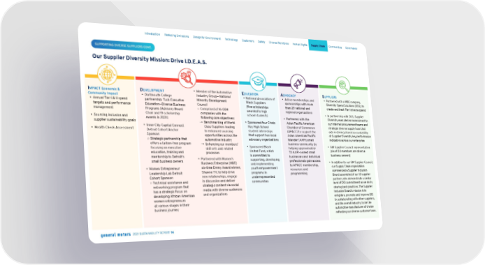 Our Supplier Diversity Mission: Drive I.D.E.A.S. SUPPORTING DIVERSE SUPPLIERS CONT. I MPACT Economic & Community Impact • Annual Tier I & II spend targets and performance management • Sourcing inclusion and supplier sustainability goals • Health Check Assessment D EVELOPMENT • Dartmouth College partnership: Tuck Executive Education—Diverse Business Programs (Advisory Board Chair and 19 scholarship awards in 2021) • Inner City Capital Connect Detroit Cohort Anchor Sponsor: ○ Strategic partnership that offers a tuition-free program focusing on executive education, training and mentorship to Detroit’s small business owners • Women Entrepreneur Leadership Lab Detroit Cohort Sponsor: ○ Technical assistance and networking program that has a strategic focus on developing African American women entrepreneurs at various stages in their business journey • Member of the Automotive Industry Group— National Minority Development Council ○ Comprised of 16 OEM companies with the following core objectives: ➞ Benchmarking of World Class Suppliers leading to enhanced sourcing opportunities across the automotive industry ➞ Enhancing our members’ skill sets and related processes • Partnered with Women’s Business Enterprise (WBE) six-time Emmy Award winner, Shawne TV, to help drive new relationships, engage in discussion and deliver strategic content via social media with diverse audiences and organizations E DUCATION • National Association of Black Suppliers (five scholarships awarded to high school students) • Sponsored four Cristo Rey High School student internships that support two local advocacy organizations • Sponsored Black United Fund, which is committed to supporting, developing and implementing youth empowerment programs in underrepresented communities A DVOCACY • Active memberships and sponsorships with more than 20 national and regional organizations • Partnered with the Asian Pacific American Chamber of Commerce (APACC) to support the Asian American Pacific Islander (AAPI) small business community by helping approximately 70 AAPI-owned small businesses and individual professionals gain access to APACC membership, resources and programming S UPPLIERS • Partnered with a WBE company, Diversity Spend Solutions (DSS), to create and track Tier I diverse spend • In partnership with DSS, Supplier Diversity executed an assessment to our internal procurement teams and strategic diverse supply base that aids in driving shared accountability of Supplier Diversity key performance indicators across our enterprise • GM Supplier Council representation (six of 20 members are diverse business owners) • In addition to our GM Supplier Council, our Supply Chain organization commenced a Supplier Inclusion Board assembled of our 13 supplier partners who demonstrate a similar level of DEI commitment as we do by sharing best practices. The Supplier Inclusion Board’s mission is to enlighten, promote and improve DEI by collaborating with other suppliers, and the overall industry, to be the automotive manufacturer of choice reflecting our diverse customer base. Skip Navigation Introduction Reducing Emissions Design for Environment Technology Customers Safety Diverse Workforce Human Rights Supply Chain Communities Governance 2021 SUSTAINABILITY REPORT 96