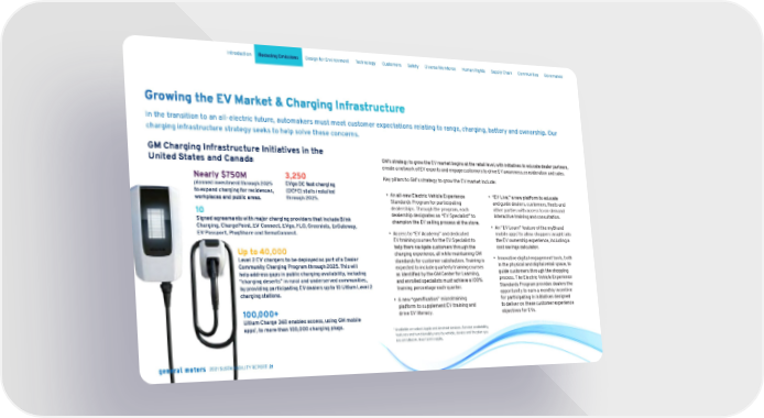 Growing the EV Market & Charging Infrastructure In the transition to an all-electric future, automakers must meet customer expectations relating to range, charging, battery and ownership. Our charging infrastructure strategy seeks to help solve these concerns. GM Charging Infrastructure Initiatives in the United States and Canada Nearly $750M planned investment through 2025 to expand charging for residences, workplaces and public areas. 3,250 EVgo DC fast charging (DCFC) stalls installed through 2025. 10 Signed agreements with major charging providers that include Blink Charging, ChargePoint, EV Connect, EVgo, FLO, Greenlots, EvGateway, EV Passport, PlugShare and SemaConnect. Up to 40,000 Level 2 EV chargers to be deployed as part of a Dealer Community Charging Program through 2025. This will help address gaps in public charging availability, including “charging deserts” in rural and underserved communities, by providing participating EV dealers up to 10 Ultium Level 2 charging stations. 100,000+ Ultium Charge 360 enables access, using GM mobile apps 1 , to more than 100,000 charging plugs. GM’s strategy to grow the EV market begins at the retail level, with initiatives to educate dealer partners, create a network of EV experts and engage customers to drive EV awareness, consideration and sales. Key pillars to GM’s strategy to grow the EV market include: • An all-new Electric Vehicle Experience Standards Program for participating dealerships. Through the program, each dealership designates an “EV Specialist” to champion the EV selling process at the store. • Access to “EV Academy” and dedicated EV training courses for the EV Specialist to help them navigate customers through the charging experience, all while maintaining GM standards for customer satisfaction. Training is expected to include quarterly training courses as identified by the GM Center for Learning, and enrolled specialists must achieve a 100% training percentage each quarter. • A new “gamification” microtraining platform to supplement EV training and drive EV literacy. • “EV Live,” a new platform to educate and guide dealers, customers, fleets and other parties with access to on-demand interactive training and consultation. • An “EV Learn” feature of the myBrand mobile apps 1 to allow shoppers insight into the EV ownership experience, including a cost savings calculator. • Innovative digital engagement tools, both in the physical and digital retail space, to guide customers through the shopping process. The Electric Vehicle Experience Standards Program provides dealers the opportunity to earn a monthly incentive for participating in initiatives designed to deliver on these customer experience objectives for EVs. 1 A vailable on select Apple and Android devices. Service availability, features and functionality vary by vehicle, device and the plan you are enrolled in. User terms apply. Skip Navigation Introduction Reducing Emissions Design for Environment Technology Customers Safety Diverse Workforce Human Rights Supply Chain Communities Governance 2021 SUSTAINABILITY REPORT 21