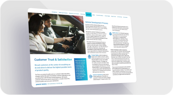 Customer Trust & Satisfaction We put customers at the center of everything we do and strive to deliver the highest possible levels of product quality. Our focus on product quality and our customers aligns the entire company behind the goal of exceeding customer expectations and providing them with the best overall experience. GM brands, products and services aim for benchmarks in studies measuring product quality and consumer satisfaction. Vehicle Development Process Our focus on the customer defines how we develop, engineer and manufacture our vehicles with quality and durability goals in mind, starting with the vehicle development process. We harness customer feedback from global markets to help shape our customers’ product experience, using our GM Compass customer survey to gather preferences on a variety of issues—from performance and efficiency to how people interact with their vehicles. The Global Vehicle Development Process is rooted in a cultural commitment to design, engineer and build quality vehicles. Building upon GM’s “Who We Are” and “How We Behave” foundational statements, employees are committed to a goal of delivering quality as a value supported by key initiatives and behaviors. This commitment involves three elements: Product Safety , which includes our Speak Up For Safety program, Safety Field Investigation processes, Prevent Repeat Defects process and Safety Incident Protocols. The Speak Up For Safety program and Safety Field Investigation processes help identify and investigate potential issues. Prevent Repeat Defects is one of the approaches we use to help confirm field learnings are captured in our standard work to prevent the issue from reoccurring. Systems Engineering , which uses a systems approach to translate our customers’ needs into industry-leading vehicle designs. IT-based systems help map, flow and trace requirements across engineering organizations to help ensure our products are safe, reliable and win in the marketplace. Quality Chain is an integrated approach to connecting quality tools and methods that enables cross-functional team collaboration to mitigate defects from reaching our customers. This is executed by connecting vehicle-level requirements to system, subsystem and component levels. This helps drive enterprisewide engagement so design and process issues can be mitigated across all systems and processes. We also emphasize systems engineering companywide. This includes requiring all people to practice the discipline of systems thinking, understanding how their individual roles contribute to the bigger picture, rather than thinking in silos. GM also has quality tools that work as interconnected processes and cross system and organizational boundaries. Using these tools together helps us build discipline into our process for identifying and addressing failure modes. These product development centric elements are foundational and complemented by our Launch Excellence initiative. The initiative uses affinity diagrams to help teams focus on what must be true in terms of process and discipline to successfully navigate vehicle development. Beginning with 2022 model year vehicles, a new warranty was announced in the United States and Canada that will provide coverage for any seatbelt or airbag system for six years or 72,000 miles, whichever comes first. Skip Navigation Introduction Reducing Emissions Design for Environment Technology Customers Safety Diverse Workforce Human Rights Supply Chain Communities Governance 2021 SUSTAINABILITY REPORT 49