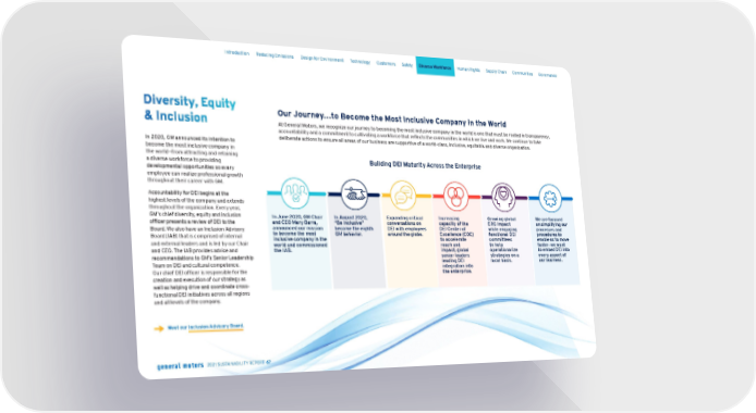 Diversity, Equity & Inclusion In 2020, GM announced its intention to become the most inclusive company in the world—from attracting and retaining a diverse workforce to providing developmental opportunities so every employee can realize professional growth throughout their career with GM. Accountability for DEI begins at the highest levels of the company and extends throughout the organization. Every year, GM’s chief diversity, equity and inclusion officer presents a review of DEI to the Board. We also have an Inclusion Advisory Board (IAB) that is comprised of internal and external leaders and is led by our Chair and CEO. The IAB provides advice and recommendations to GM’s Senior Leadership Team on DEI and cultural competence. Our chief DEI officer is responsible for the creation and execution of our strategy as well as helping drive and coordinate cross- functional DEI initiatives across all regions and all levels of the company. Meet our Inclusion Advisory Board . → Our Journey...to Become the Most Inclusive Company in the World At General Motors, we recognize our journey to becoming the most inclusive company in the world is one that must be rooted in transparency, accountability and a commitment to cultivating a workforce that reflects the communities in which we live and work. We continue to take deliberate actions to ensure all areas of our business are supportive of a world-class, inclusive, equitable and diverse organization. Building DEI Maturity Across the Enterprise In June 2020, GM Chair and CEO Mary Barra, announced our mission to become the most inclusive company in the world and commissioned the IAB. In August 2020, “Be Inclusive” became the eighth GM behavior. Expanding critical conversations on DEI with employees around the globe. Increasing capacity of the DEI Center of Excellence (COE) to accelerate reach and impact; global senior leaders leading DEI integration into the enterprise. Growing global ERG impact while engaging functional DEI committees to help operationalize strategies on a local basis. We are focused on simplifying our processes and procedures to enable us to move faster—we want to embed DEI into every aspect of our business. Skip Navigation Introduction Reducing Emissions Design for Environment Technology Customers Safety Diverse Workforce Human Rights Supply Chain Communities Governance 2021 SUSTAINABILITY REPORT 67