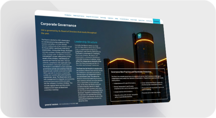 Corporate Governance GM is governed by its Board of Directors that meets throughout the year. The Board is elected by GM’s shareholders to oversee and provide guidance on GM’s business and affairs. It is the ultimate decision-making body of the company, except for those matters specifically reserved to shareholders. Among other things, the Board oversees company strategy and execution of the strategic plan. In addition, it oversees management’s proper safeguarding of the assets of the company, maintenance of appropriate financial and other internal controls, compliance with applicable laws and regulations and proper governance. The Board is committed to sound corporate governance policies and practices that are designed and routinely assessed to enable GM to operate its business responsibly, sustain our success and build long-term shareholder value. The Board also works with management to integrate environmental, social and governance (ESG) principles into the company’s business strategy. This includes agenda items and discussions related to ESG topics at Board and committee meetings. Leadership Structure Currently, the Board is led by our Chair and CEO, Mary Barra, whose role as Board Chair is complemented by that of our Independent Lead Director, Patricia Russo. The Board is comprised of 13 members, all but one of whom—Ms. Barra—are independent, as defined by the Board’s Corporate Governance Guidelines, which reflect the independence standards of the New York Stock Exchange and the U.S. Securities and Exchange Commission. The Board has the flexibility to decide when the positions of Board Chair and CEO should be combined or separated and whether a GM executive or an independent director should be Board Chair. This allows the Board to choose the leadership structure that it believes will best serve the interests of our shareholders at any particular time. At this time, the Board continues to believe that Ms. Barra’s in-depth knowledge of GM’s business and vision for the future bring focused leadership to the Board. Therefore, combining the role of Chair and CEO and electing a strong Independent Lead Director results in the optimal Board leadership structure for GM at this time. Governance Best Practices and Shareholder Protections The Board has adopted governance structures and policies that it believes promote Board independence and protect the interests of shareholders. These structures and policies include, among others: • Independence of 12 out of 13 directors. • Strong Independent Lead Director empowered with clearly delineated duties. • Annual election of all directors. • Majority voting with director resignation policy in uncontested elections. • Annual review of the Board’s leadership structure by the independent directors. • Proxy access and shareholder right to call special meetings. • No poison pill or dual-class shares. Skip Navigation Introduction Reducing Emissions Design for Environment Technology Customers Safety Diverse Workforce Human Rights Supply Chain Communities Governance 2021 SUSTAINABILITY REPORT 105