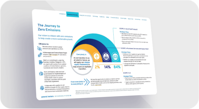 The Journey to Zero Emissions Our vision is a future with zero emissions to help create a more sustainable planet. GM plans to: Become carbon neutral in global products and operations by 2040. Achieve approved Science Based Target initiative ( SBTi) targets for operations and products. Meet our commitments under the Business Ambition Pledge for 1.5°C, an urgent call to action from a global coalition of United Nations agencies, businesses and industry leaders. Work with federal, state and local governments for implementation of supportive policies to move the United States closer to carbon neutrality consistent with the goals of the Paris Agreement. Collaborate with suppliers to set ambitious targets for the supply chain to reduce emissions, increase transparency and source more sustainable materials. Everybody in As we transition to an all-electric future, we will apply our climate equity framework to help ensure an equitable transition. 2% SCOPE 1 & 2 Strategic Plans • Plan to source 100% renewable electricity at sites in the United States by 2025 and globally by 2035. • Target a reduction in operational energy intensity by 35% by 2035 against a 2010 baseline. 14% SCOPE 3—Purchased Services and Supply Chain 2 Strategic Plans • Inviting our Tier I suppliers to sign the GM ESG Partnership Pledge to show their commitment to the principles of sustainability and human rights. • Monitor our suppliers' environmental and social progress through CDP and EcoVadis. • Leverage the GM Partner Sustainability Framework for suppliers to set goals. 84% SCOPE 3—Use of Sold Products 1 Strategic Plans • Take action to reach 1M+ planned units of EV capacity in each of North America and China by 2025. • Plan to achieve sales of 40% to 50% of annual U.S. volumes of EVs by 2030. • Plan to eliminate tailpipe emissions from new light-duty vehicles by 2035. From everybody in to everything in We have the opportunity to extend our electric and fuel cell technologies beyond light-duty vehicles to other transportation modes such as rail, shipping and heavy-duty trucks. Learn more . 1 A ligned with the SBTi for Scope 3, use of sold products. The SBTi standards require well-to-wheel (from fuel production to vehicle driving) for vehicle CO2 intensity (gCO2/km) calculations. We have revised our numbers for 2018 through 2020 for this requirement. Going forward, GM will use the SBTi standards in calculating vehicle CO2 intensity. 2 Inc ludes other Scope 3 categories. Skip Navigation Introduction Reducing Emissions Design for Environment Technology Customers Safety Diverse Workforce Human Rights Supply Chain Communities Governance 2021 SUSTAINABILITY REPORT 15