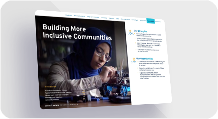 Building More Inclusive Communities IN THIS SECTION An Inclusive Social Impact Strategy 99 Funding to Support an Equitable Transition 100 Climate Equity Fund: Year 1 Highlights 101 Investing in Our Hometown 101 Community Relations 102 Our Strengths y Contributing our time and talents to benefit underserved communities y Building positive relationships in communities that strengthen our social license to operate y Using the power of our voice to advocate internally and externally, for a future with equity and inclusion for all y Ensuring an equitable transition to an all-electric future Our Opportunities y Continuing to work to make sure that everyone in our communities has an equitable chance to succeed y Measuring social impact in a meaningful and statistically rigorous way y Supporting communities that are disproportionately affected by climate change through our Climate Equity Fund and other initiatives Skip Navigation Introduction Reducing Emissions Design for Environment Technology Customers Safety Diverse Workforce Human Rights Supply Chain Communities Governance 2021 SUSTAINABILITY REPORT 98