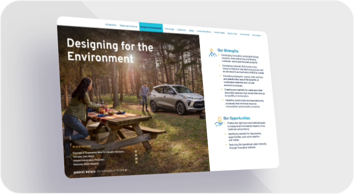 Designing for the Environment IN THIS SECTION Sourcing & Engineering More Sustainable Materials 32 Pursuing Zero Waste 36 Nature Conservancy Programs 38 Reducing Water Intensity 39 Our Strengths y Developing innovative sustainable design solutions while delivering outstanding customer- and brand-focused products y Developing materials that involve a less resource-intensive manufacturing process and do not result in as much end-of-life (EoL) waste y Educating employees, supply chain partners and stakeholders about the benefits of sustainable materials and circular economy processes y Creating end-markets for waste and other discarded materials that would otherwise go to landfills or incinerators y Adopting construction and manufacturing processes that minimize resource consumption and promote circularity Our Opportunities y Finding the right tools and methodologies to measure environmental impacts of our materials and products y Identifying markets for repurposing opportunities, such as for plastics and metals y Reducing GM operational water intensity through innovative methods Skip Navigation Introduction Reducing Emissions Design for Environment Technology Customers Safety Diverse Workforce Human Rights Supply Chain Communities Governance 2021 SUSTAINABILITY REPORT 31