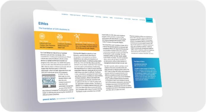 Ethics The foundation of GM’s business is: Our Core Behaviors help drive our business decisions and activities worldwide. GM is committed to creating and maintaining an ethical culture and conducts ethical culture surveys across our global workforce to monitor our progress every few years. Our 2020 third-party survey results show that internal perceptions of GM’s ethical culture continue to increase and are higher than the third-party’s 2018–2019 benchmark, which includes responses from over 500,000 individuals across 32 companies. In 2022, for the third year in a row, General Motors was also the only original equipment manufacturer automaker recognized as one of the World’s Most Ethical Companies ® by Ethisphere, a global leader in defining and advancing the standards of ethical business practices. Winning with Integrity is one of our Core Behaviors, and the World’s Most Ethical designation is a testament to our ethical leadership as we continue to transform our company and industry. An ethical business starts at the top. Chair and CEO Mary Barra and other members of our Senior Leadership Team regularly issue messages to all employees emphasizing the importance of our Code of Conduct and their expectation that every employee strive to do the right thing, even when it is difficult. The Board is also committed to upholding the highest legal and ethical conduct in fulfilling its responsibilities. All Board members, officers and employees are expected to act ethically at all times and to adhere to the law, our Code of Conduct and any applicable company policies. The Board, in addition to our eligible salaried employees (e.g., everyone other than those on excused leave), also completes GM’s Code of Conduct training. The Board’s Audit Committee has oversight responsibility for GM’s ethics and compliance program, which promotes a culture of high performance with high integrity by advocating and helping implement the principles of GM’s Code of Conduct—Winning with Integrity. The Global Ethics and Compliance Center (GECC) is led by the assistant general counsel and chief compliance officer, who reports to the executive vice president of global public policy, general counsel and corporate secretary, and indirectly to the Board’s Audit Committee. The chief compliance officer provides regular updates to the Audit Committee. The chief compliance officer meets with the Audit Committee in private sessions without other members of management present at least once per year. The GECC prevents, detects and helps correct violations of law and corporate policies and helps promote our ethical business culture. The GECC seeks to align GM’s ethics and compliance program with the recognized elements of an effective compliance program and primarily manages GM’s Code of Conduct; Non-Retaliation Policy; conflict of interest disclosure process; investigations; ethics and compliance training and communications; global policy development; compliance assurance; risk-based third-party due diligence; whistleblower line; anti-corruption compliance assurance in GM strategic transactions; and other anti-corruption risk areas. Regional compliance officers are established in each of GM’s operating regions to help ensure compliance and ethics globally. We also have a network of compliance liaisons, as well as other compliance personnel located throughout GM who provide guidance to employees and answer ethics and compliance questions. Additional global structures and oversight are in place for safety, export compliance, antitrust compliance, data/cybersecurity compliance, records management compliance and other risk areas. The Role of Ethics Compliance Liaisons In 2021, we launched a new Compliance Liaison program to help further localize compliance into business units and to serve as an additional knowledgeable resource for identifying compliance issues. Compliance liaisons are GM team members supporting business units and regions who help detect, prevent and resolve potential compliance issues across the company. Our Vision A World with Zero Crashes, Zero Emissions and Zero Congestion Our Core Values Customers, Excellence, Relationships and S e ek Tr u th Our Eight Core Behaviors Be Inclusive, Think Customer, Innovate Now, Look Ahead, One Team, Be Bold, It’s On Me, and Win with Integrity Skip Navigation Introduction Reducing Emissions Design for Environment Technology Customers Safety Diverse Workforce Human Rights Supply Chain Communities Governance 2021 SUSTAINABILITY REPORT 114
