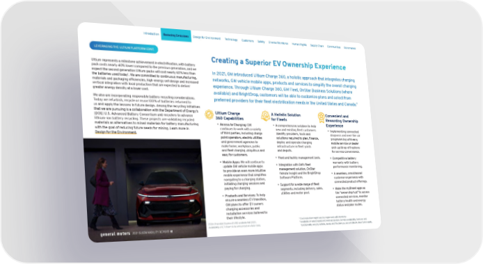 LEVERAGING THE ULTIUM PLATFORM CONT. Ultium represents a milestone achievement in electrification, with battery pack costs nearly 40% lower compared to the previous generation, and we expect the second generation Ultium packs will cost nearly 60% less than the batteries used today 1 . We are committed to continuous manufacturing, materials and packaging efficiencies, high-energy cell design and increased vertical integration with local production that are expected to deliver greater energy density at a lower cost. We also are incorporating responsible battery recycling considerations. Today we refurbish, recycle or reuse 100% of batteries returned to us and apply the lessons in future design. Among the recycling initiatives that we are pursuing is a collaboration with the Department of Energy’s (DOE) U.S. Advanced Battery Consortium and recyclers to advance lithium-ion battery recycling. These projects are validating recycled materials as alternatives to mined materials for battery manufacturing with the goal of reducing future needs for mining. Learn more in Design for the Environment . Creating a Superior EV Ownership Experience In 2021, GM introduced Ultium Charge 360, a holistic approach that integrates charging networks, GM vehicle mobile apps, products and services to simplify the overall charging experience. Through Ultium Charge 360, GM Fleet, OnStar Business Solutions (where available) and BrightDrop, customers will be able to customize plans and select from preferred providers for their fleet electrification needs in the United States and Canada. 2 Ultium Charge 360 Capabilities • Access to Charging: GM continues to work with a variety of third parties, including charge point operators, electric utilities and government agencies to make home, workplace, public and fleet charging ubiquitous and easy for customers. • Mobile Apps: We will continue to update GM vehicle mobile apps to provide an even more intuitive mobile experience that simplifies navigating to a charging station, initiating charging sessions and paying for charging. • Products and Services: To help ensure a seamless EV transition, GM plans to offer EV owners charging accessories and installation services tailored to their lifestyle. A Holistic Solution for Fleets • A comprehensive solution to help new and existing fleet customers identify providers, tools and solutions required to plan, finance, deploy and operate charging infrastructure in fleet yards and depots. • Fleet and facility management tools. • Integration with GM’s fleet management solution, OnStar Vehicle Insight and the BrightDrop Software Platform. • Support for a wide range of fleet segments, including delivery, sales, utilities and motor pool. Convenient and Rewarding Ownership Experience • Implementing connected diagnosis and over-the-air programming with easy mobile service or dealer pick-up/drop-off options for service convenience. • Competitive battery warranty with battery performance monitoring. • A seamless, omnichannel customer experience with connected product offerings. • Make the myBrand apps as the “ownership hub” to access connected services, monitor battery health and energy status and plan routes. 2024 Chevrolet Equinox EV RS available Fall 2023. Availability of LT shown to be announced at a later date. 1 C ost reduction might vary by region and cell chemistry. 2 A vailable on select Apple and Android devices. Service availability, features and functionality vary by vehicle, device and the plan you are enrolled in. User terms apply. Skip Navigation Introduction Reducing Emissions Design for Environment Technology Customers Safety Diverse Workforce Human Rights Supply Chain Communities Governance 2021 SUSTAINABILITY REPORT 18