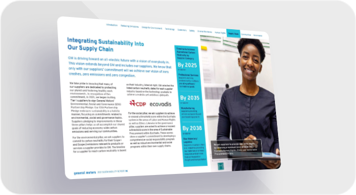Integrating Sustainability Into Our Supply Chain GM is driving toward an all-electric future with a vision of everybody in. This vision extends beyond GM and includes our suppliers. We know that only with our suppliers’ commitment will we achieve our vision of zero crashes, zero emissions and zero congestion. We take pride in knowing that many of our suppliers are dedicated to protecting our planet and fostering healthy work environments. In recognition of this commitment, in 2021, we began inviting Tier I suppliers to sign General Motors’ Environmental, Social and Governance (ESG) Partnership Pledge. Our ESG Partnership Pledge embraces sustainability in a holistic manner, focusing on commitments related to environmental, social and governance topics. Suppliers pledging to improvements in these three pillars helps us all accomplish our shared goals of reducing economy-wide carbon emissions and serving our communities. For the environmental pillar, we ask suppliers to commit to carbon neutrality for their Scope 1 and Scope 2 emissions relevant to products or services a supplier provides to GM. The timeline for a supplier to reach carbon neutrality is based on their industry, listed at right. GM selected the listed carbon neutrality dates for each supplier industry based on the technology available to achieve a realistic yet ambitious glidepath. For the social pillar, we ask suppliers to achieve or exceed a threshold score within the EcoVadis system in the areas of Labor and Human Rights as well as Ethics. Likewise in the governance pillar, suppliers are asked to achieve or exceed a threshold score in the area of Sustainable Procurement within EcoVadis. These scores show a supplier’s commitment to developing a comprehensive social responsibility program as well as robust environmental and social programs within their own supply chains. Timeline to Achieve Aspirational Carbon Neutrality by Supplier Category By 2025 or sooner Professional Services Suppliers working predominantly in offices providing software/ nonmaterial goods By 2035 or sooner Manufacturing Suppliers providing vehicle components and purchased equipment By 2038 or sooner Raw Materials/ Logistics Suppliers in carbon-inten- sive industries providing raw materials or primary resources and services that are focused on freight and transportation We ask suppliers to provide near-term results by obtaining a minimum score of 50 in the EcoVadis Human Rights, Ethics and Sustainable Procurement Pillars. Skip Navigation Introduction Reducing Emissions Design for Environment Technology Customers Safety Diverse Workforce Human Rights Supply Chain Communities Governance 2021 SUSTAINABILITY REPORT 86