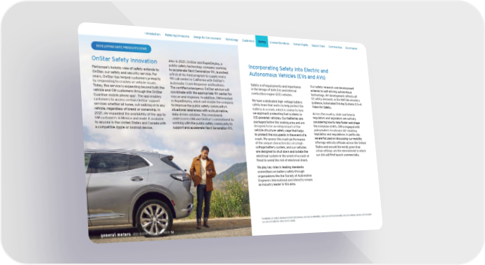 DEVELOPING SAFE PRODUCTS CONT. OnStar Safety Innovation Periscope’s holistic view of safety extends to OnStar, our safety and security service. For years, OnStar has helped customers primarily by responding to crashes or vehicle issues. Today, the service is expanding beyond both the vehicle and GM customers through the OnStar Guardian mobile phone app 1 . The app enables customers to access certain OnStar support services whether at home, out walking or in any vehicle, regardless of brand or ownership. In 2021, we expanded the availability of the app to GM customers in Mexico and made it available to anyone in the United States and Canada with a compatible Apple or Android device. Also in 2021, OnStar and RapidDeploy, a public safety technology company working to accelerate Next Generation 911, launched a first-of-its-kind program to supply every 911 call center in California with OnStar’s Automatic Crash Response notifications. The certified emergency OnStar advisor will coordinate with the appropriate 911 center for rescue and response. In addition, GM invested in RapidDeploy, which will enable the company to improve the public safety community’s situational awareness with a cloud-native, data-driven solution. This investment underscores GM and OnStar’s commitment to working with the public safety community to support and accelerate Next Generation 911. Incorporating Safety Into Electric and Autonomous Vehicles (EVs and AVs) Safety is of equal priority and importance in the design of both EVs and internal combustion engine (ICE) vehicles. We have a dedicated high-voltage battery safety team that works to help protect the battery in a crash, which is similar to how we approach protecting fuel systems in ICE-powered vehicles. Our batteries are packaged below the seating area and are designed to be an integral part of the vehicle structure safety cage that helps to protect the occupants in the event of a crash. We assess the crash performance of the unique characteristics of a high- voltage battery system, and our vehicles are designed to shut down and isolate the electrical system in the event of a crash or flood to avoid the risk of electrical shock. We play key roles in leading standards committees on battery safety through organizations like the Society of Automotive Engineers International and intend to remain an industry leader in this area. Our safety research and development extends to self-driving autonomous technology. AV development reflects all 12 safety elements in the NHTSA voluntary guidance, Automated Driving Systems 2.0—A Vision for Safety. Across the country, state and federal regulators and legislators are actively considering how to help foster and shape the evolution of AVs. GM is engaged with policymakers to advance AV-enabling legislation and regulations. In particular, we are focused on discussing our mobility offerings with city officials across the United States and around the world, given that urban settings are the environment in which our AVs will first launch commercially. 1 A vailable on select Apple and Android devices. Service availability, features and functionality vary by vehicle, device and the plan you are enrolled in. User terms apply. Skip Navigation Introduction Reducing Emissions Design for Environment Technology Customers Safety Diverse Workforce Human Rights Supply Chain Communities Governance 2021 SUSTAINABILITY REPORT 58